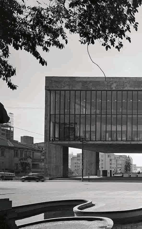 MASP’s structural system is a key element in the building’s well as in its function. In MASP, the structural language architectural form. 78 meter-long prestressed concrete beams concrete columns suspended on two gigantic columns, suspended glass volume that houses exhibitions and offices. Two central the ribbed concrete floor above and an additional ribbed floor by steel cables, while the folded-slab roof hangs from the reflecting light into the transparent galleries. Elevators only upper floor of the building to the underground space, and located in the open square only link the building to