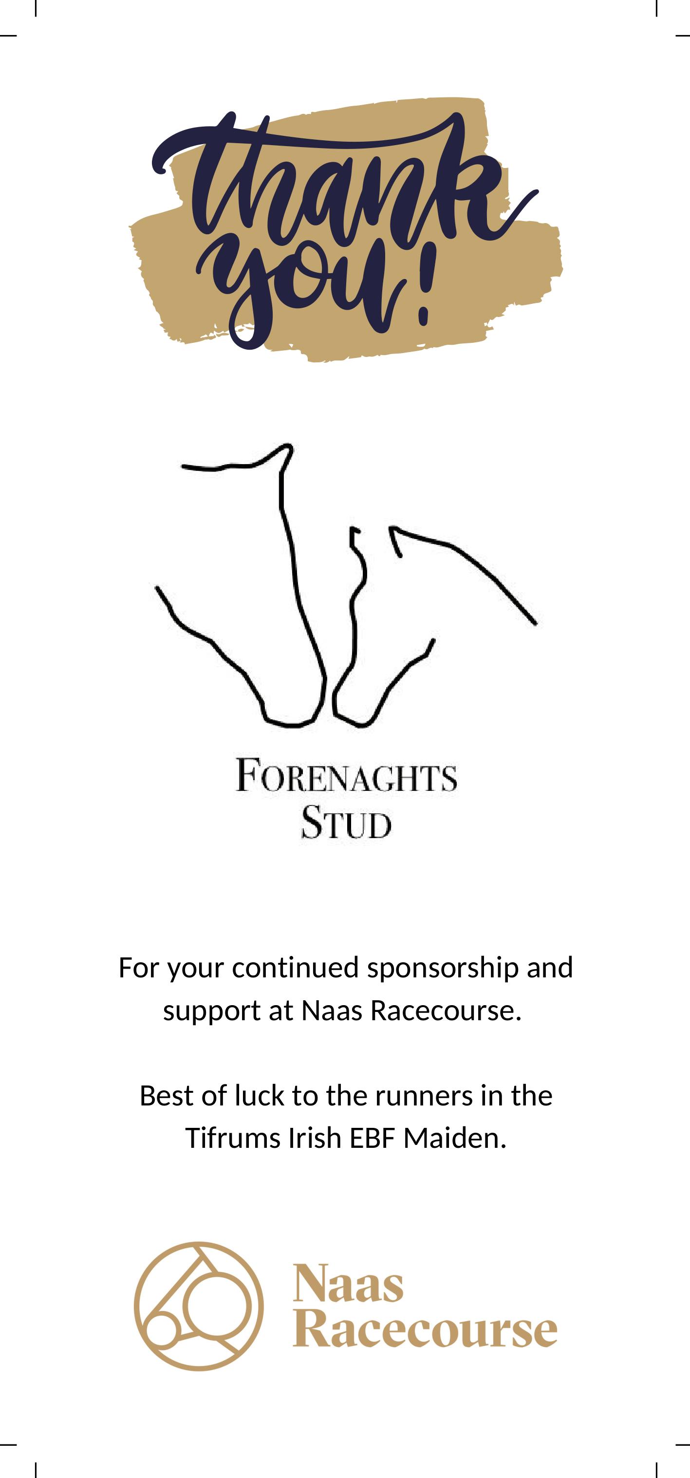 The Smurfit family are among our longest-standing sponsors, and today they sponsor the Irish EBF Tifrums Maiden with Forenaghts Stud. Tifrums was the first foundation mare for the farm, producing a Royal Ascot winner and an Italian Derby winner for the family. Forenaghts Stud, our near neighbours, has a long history of breeding and consigning quality stock that compete at the highest level on racecourses around the world. A huge thank you to the Smurfit family and their Stud Manager, Caoimhe Doherty, for their ongoing support.