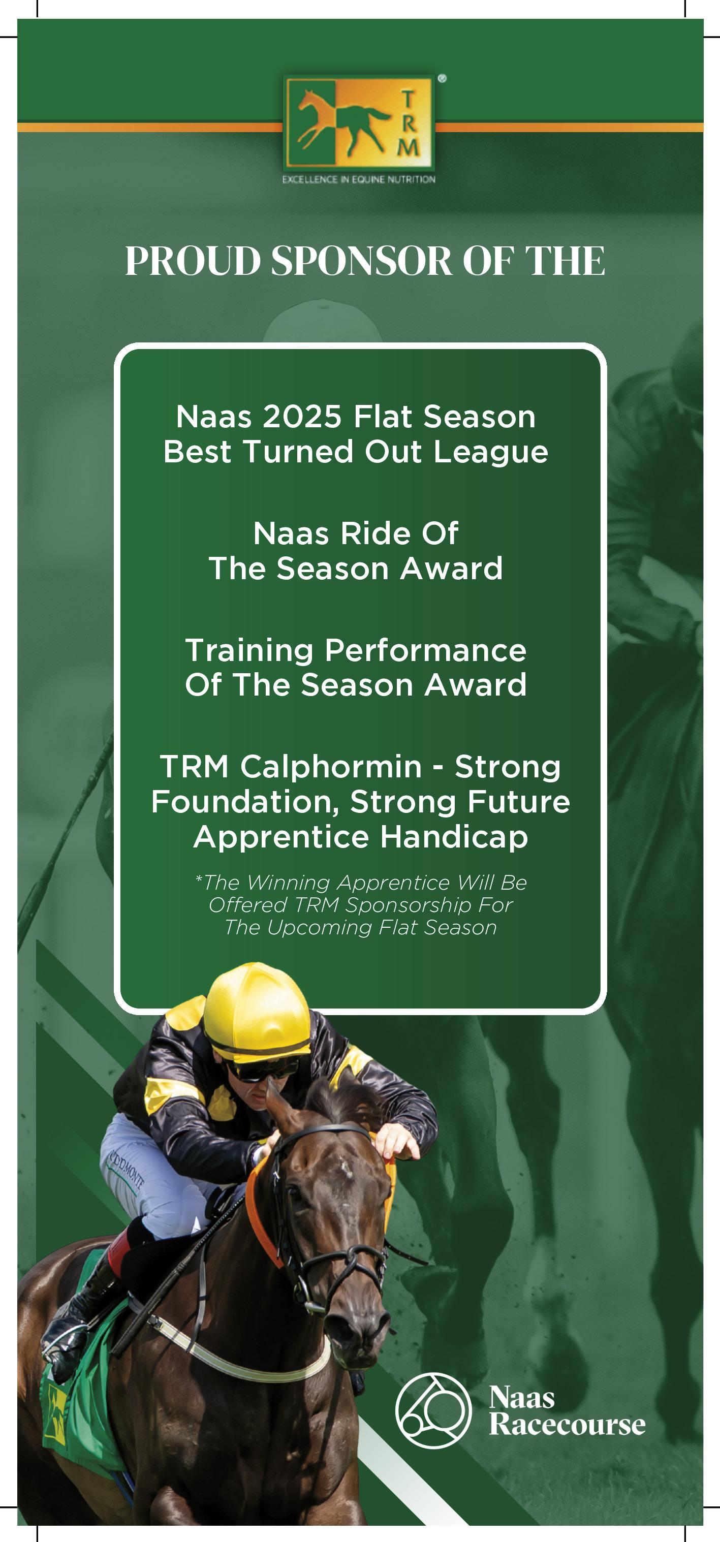 Today, we are delighted to host the TRM Awards for the TRM BTO League and the TRM Training Performance and Ride of the Season. The BTO League is judged by our sponsors and the Naas Racecourse team throughout the year. While it’s been a close contest, it looks as though Ross O’Sullivan will take home the top prize, a €1,000 TRI voucher, and we look forward to joining the team for a celebratory breakfast morning. The TRM Training Performance and Ride of the Season is a new award for 2025, voted for by our racegoers. Huge congratulations to Keithen Kennedy and Andy Slattery, who both receive €1,000 worth of TRM products in recognition of their achievements. Today also marks TRM’s final sponsorship of their six-race partnership throughout the Flat season at Naas. They conclude with sponsorship of the apprentice race, where the winning rider will be offered TRM sponsorship for a full year. Best of luck to all the young riders taking part today, and our sincere thanks to TRM for their continued support of racing at Naas.