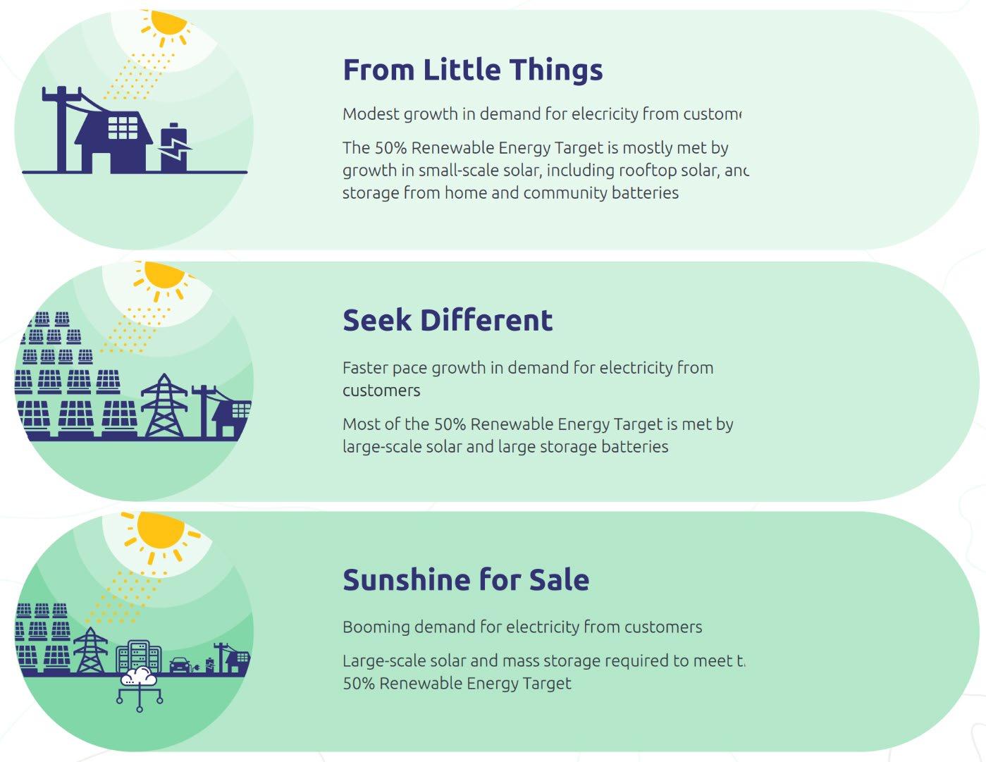 Other examples of exploratory foresighting include the multiple scenarios presented in Western Australia’s Whole of System Plan and various ‘think pieces’ developed by research organisations or consultants. Western Power’s Grid Transformation Engine also supports exploratory foresighting through its ability to investigate different future grid configurations at different periods of time. The use of ‘least regrets analysis’ in work led by Energy Networks Australia and the flexible and modular approach to the future adopted in the ACT Climate Change Strategy are also forms of exploratory foresighting.