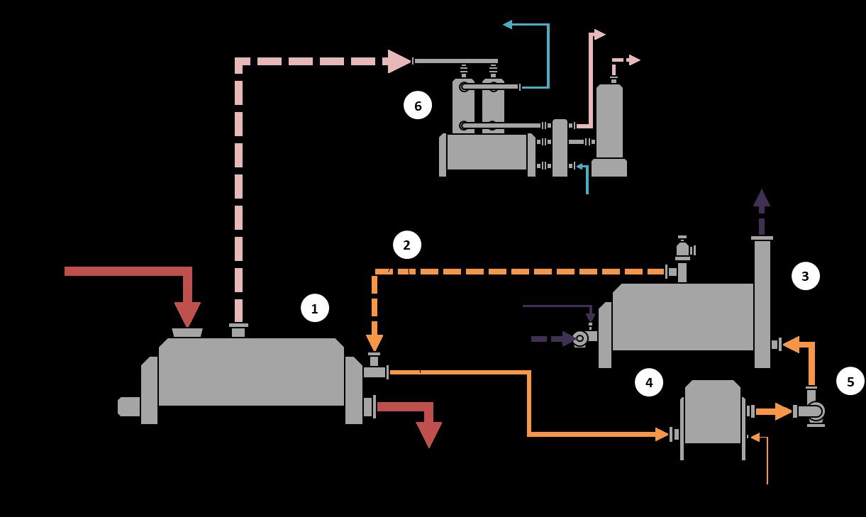 The rendering process uses thermal energy in the form of steam between 115°C to 145°C and generates low temperature waste steam at around 100°C (Evans et al. 2021). This temperature range is well suited for MVR heat pumps. MVR systems for heat recovery have so far been trialled in evaporation and concentration processes in the beverage, sugar, and dairy industries and have been shown to reduce energy consumption by 70-80% (Dahmardeh, Amiri, and Nowee 2019; Walmsley et al. 2016; Kim et al. 2022; Ahirrao 2014; Han, Si, and