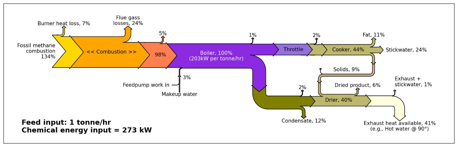 The thermodynamic analysis showed that the existing heat recovery efforts used in industry, which typically focus on generating hot water for use elsewhere in the facility (e.g. for cleaning and sterilisation) by condensing the vapour in the exhaust from a dry rendering cooker (or the drier in a wet rendering process), do a good job of recovering and further utilising the heat required to separate moisture via evaporation. However, the temperature (and hence the usefulness) of this recovered energy is significantly lower than the energy input to the system which indicates a significant loss of potential In a similar way, the use of gas combustion for thermal energy anywhere in the process represents a significant amount of wasted potential due in part to the high combustion temperature relative to the required process temperature