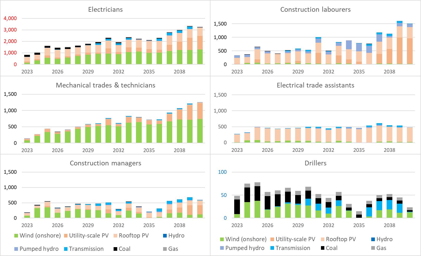 Annual requirements for the six most in-demand occupations over the entire period are shown in Figure 5 Those occupations needed in large numbers primarily during construction (such as construction labourers and managers, and electrical engineers) are very volatile, while occupations such as electricians and mechanical trades increase steadily over the entire period.