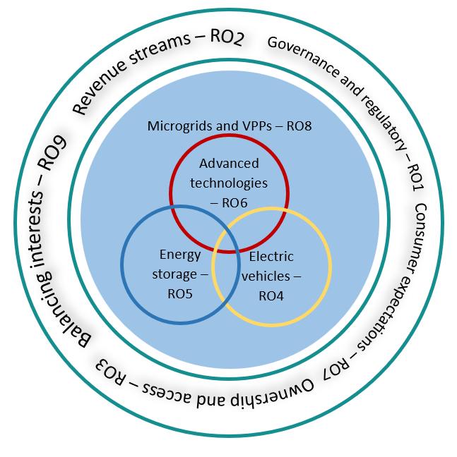 Research opportunities RO1 to RO9 are shown in Figure 2 below to reflect their broad interrelationships. Five of the nine overarching research opportunity areas cover non-technical aspects such as governance and regulation (RO1), revenue streams (RO2), ownership and access (RO3), consumer expectations (RO7) , and balancing interests (RO9). These aspects of research are commonly applicable to all the technological solutions covered in microgrids and VPPs (RO8), advanced technologies (RO6), energy storage (RO5) and electric vehicles (RO4).