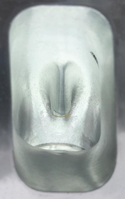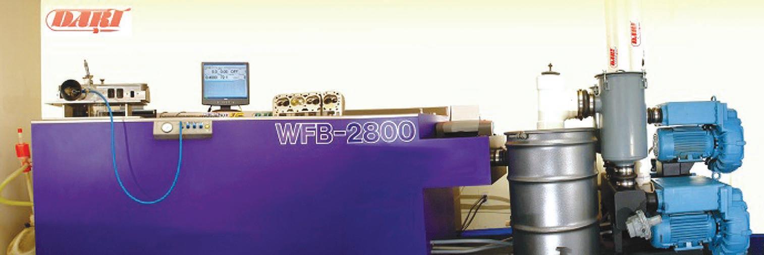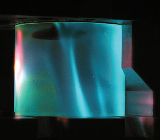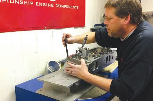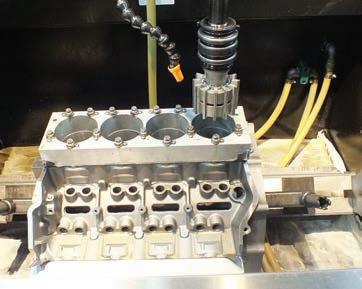 Dart’s wet flow bench uses a testing liquid with the same specifi c gravity as gasoline, which has been laced with a fluorescent dye, allowing researchers to observe the behavior of the fuel as it flows through the head. In this manner, our head designers can see what designs encourage proper fuel atomization and avoid designs that cause fuel to congeal into solid streams or become overly turbulent.