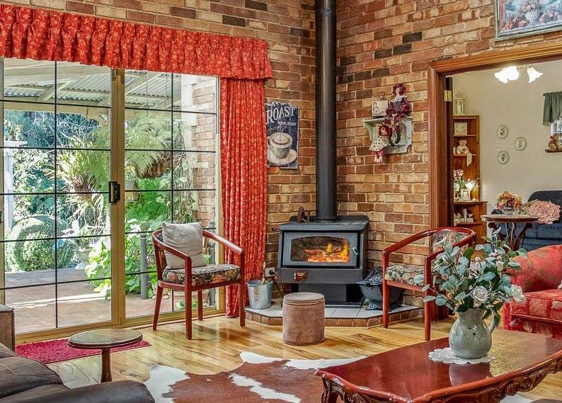 The open plan living area including kitchen has an enclosed wood fire plus reverse cycle air con and leads onto the balcony. There are attractive wooden beams throughout the home making it that extra special. Fully fenced, trees and a pretty front garden with car port.