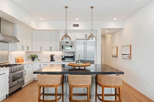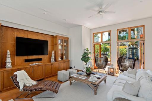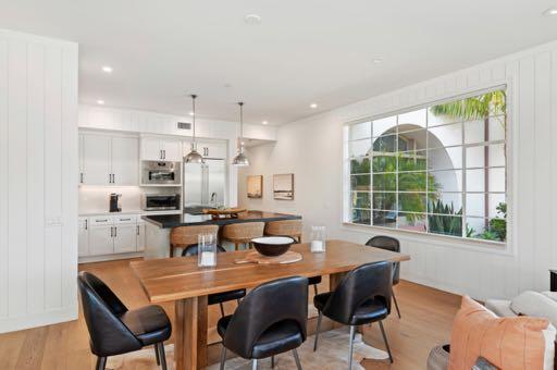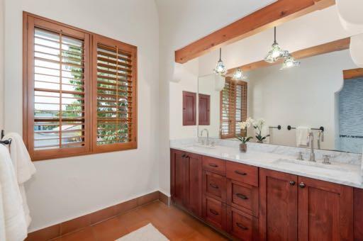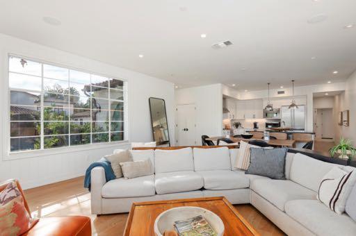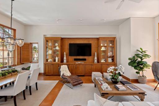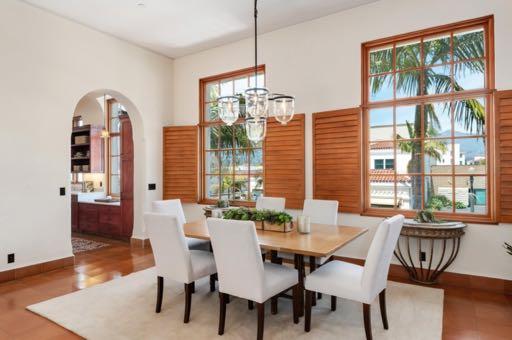 Located in West Beach, this light and bright corner unit townhome is in a prime location with close proximity to the Funk Zone, Warf and State St. This 3 bedroom, 3.5-bath townhome boasts striking arched windows in its downstairs great room; a historic nod from the original Potter Hotel. The home features bead board accents, white-washed French oak Poors, custom cabinetry, quarts and soap stone countertops, and gourmet appliances. The primary bedroom, located on the Orst level, leads to a luxurious marble primary bathroom; 2 more ensuite bedrooms are located on the second Poor. A mudroom/laundry room connects to the garage and gated parking area, giving functional Pow to the Poorplan. Saltillo tiles line the spacious and private rooftop deck with outdoor kitchen and Oreplace.