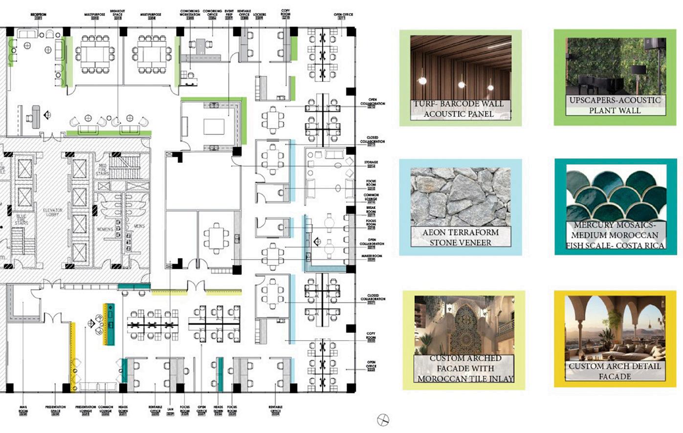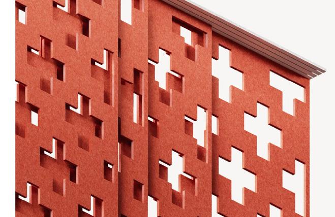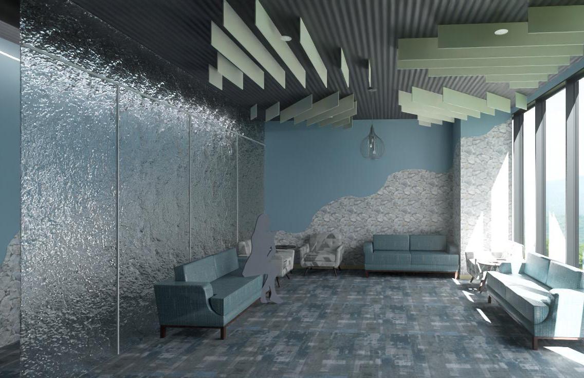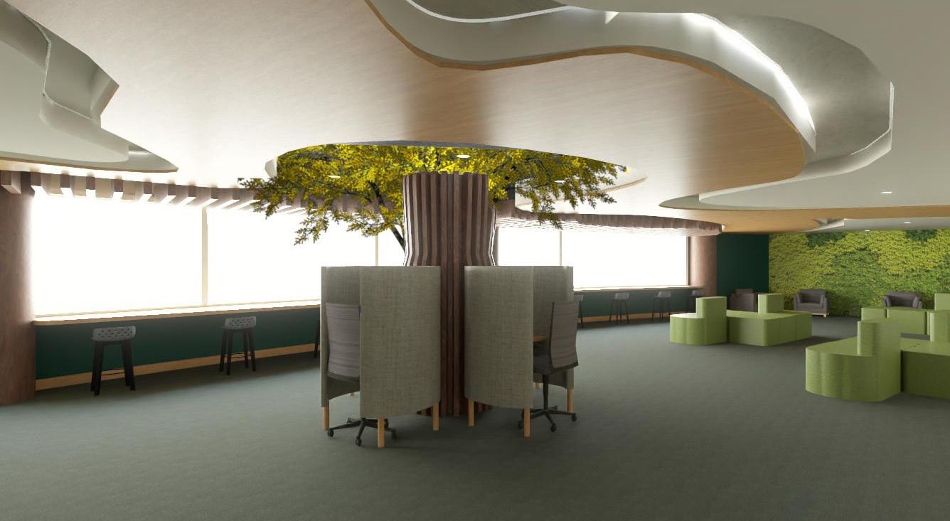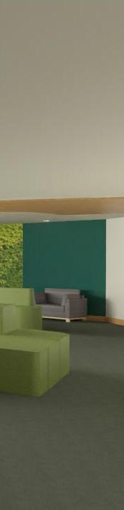 • Acoustic panels and ceilingscapes throughout Bold yet durable fabrics and textiles throughout