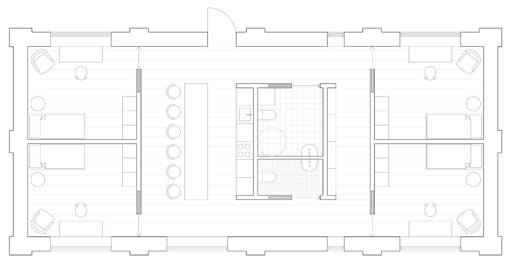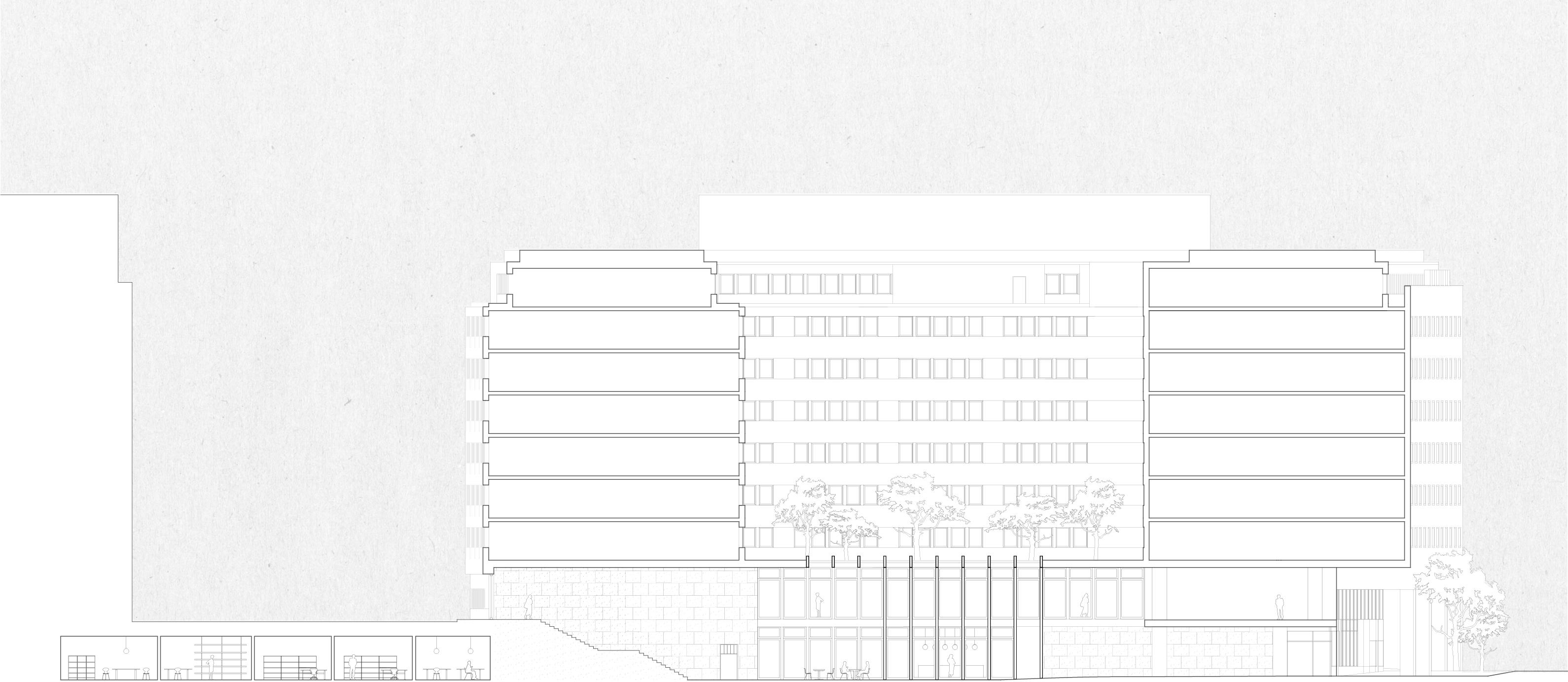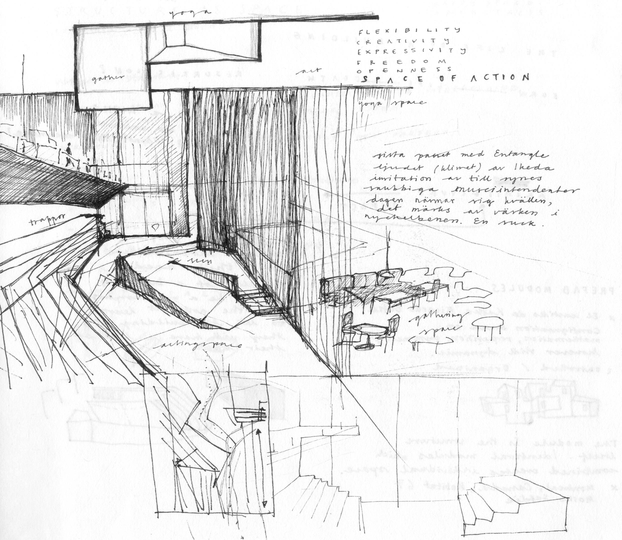 8 is regarded as an architectural palimpsest rather than a tabula rasa. Within this conceptual framework, the passage Tysta Marie is identified as a prospective site for intervention. Positioned directly beneath the open courtyard, there is an opportunity to create a link between the passage and the space utilized by the building’s users. In addition to a new connection, another space within the perimeters of the courtyard is introduced. This revisioned space holds potential for hosting diverse gatherings, becoming an addition to the current users of the property as well as a destination accessed through the passage.