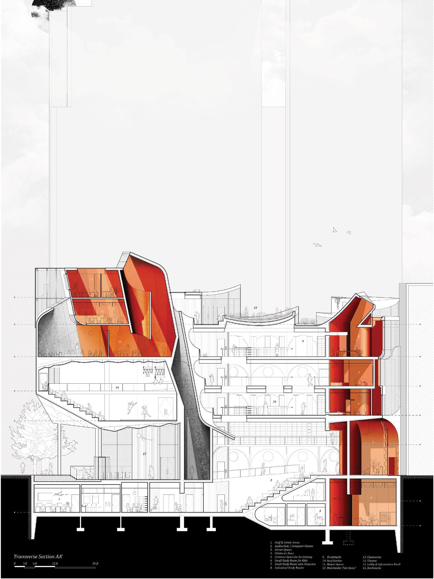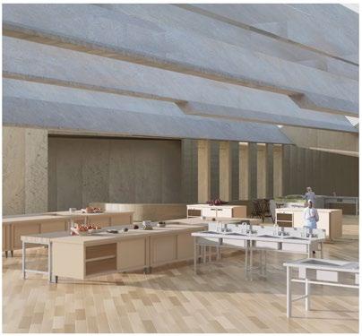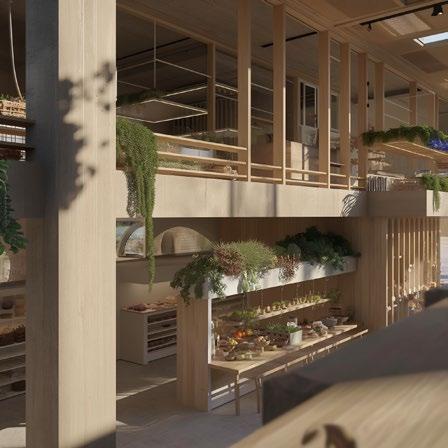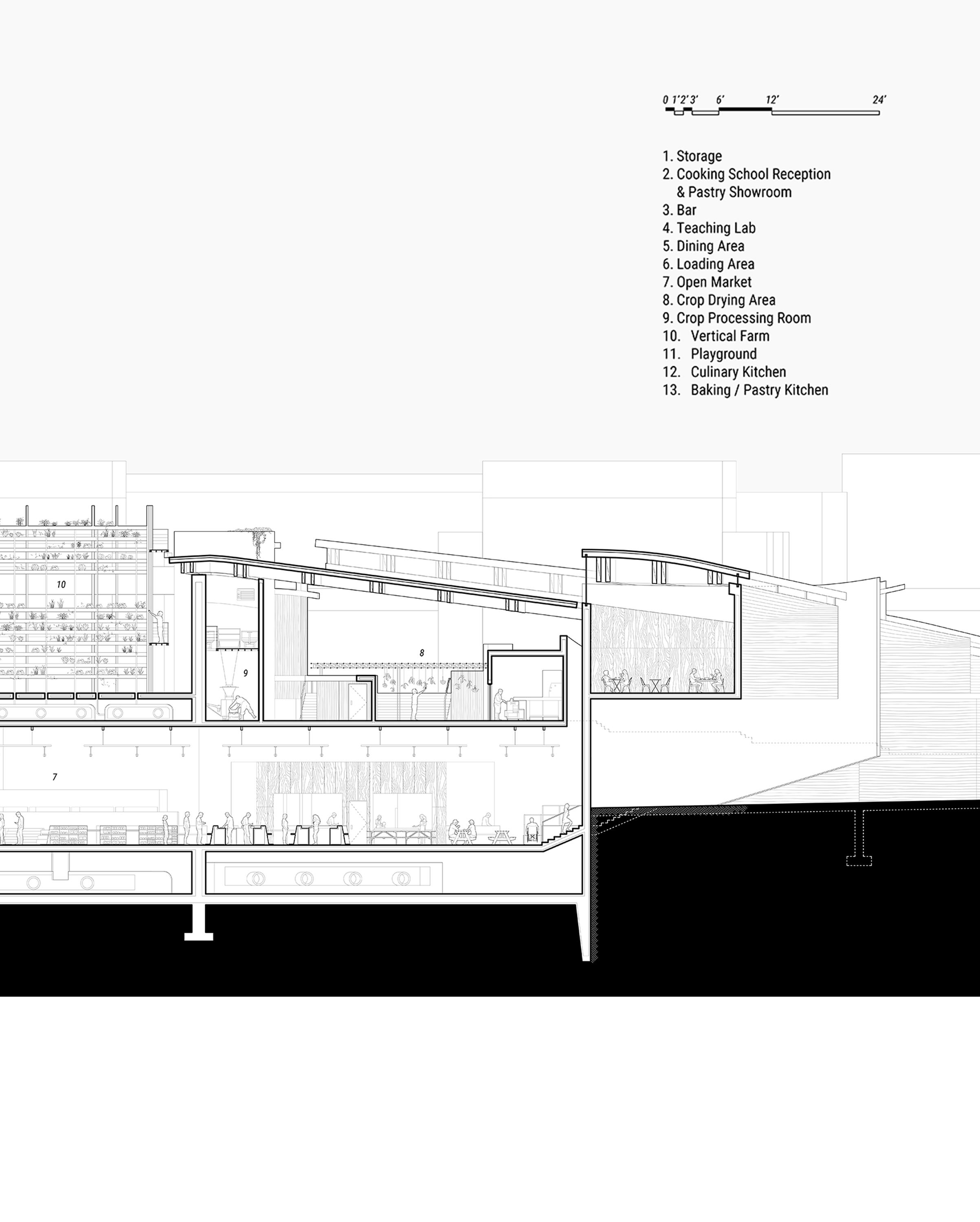 Addressing challenges like food insecurity, limited infrastructure, and socio-economic isolation, the design integrates a farmer’s market, public kitchens, vertical farming, and educational chef’s kitchen.