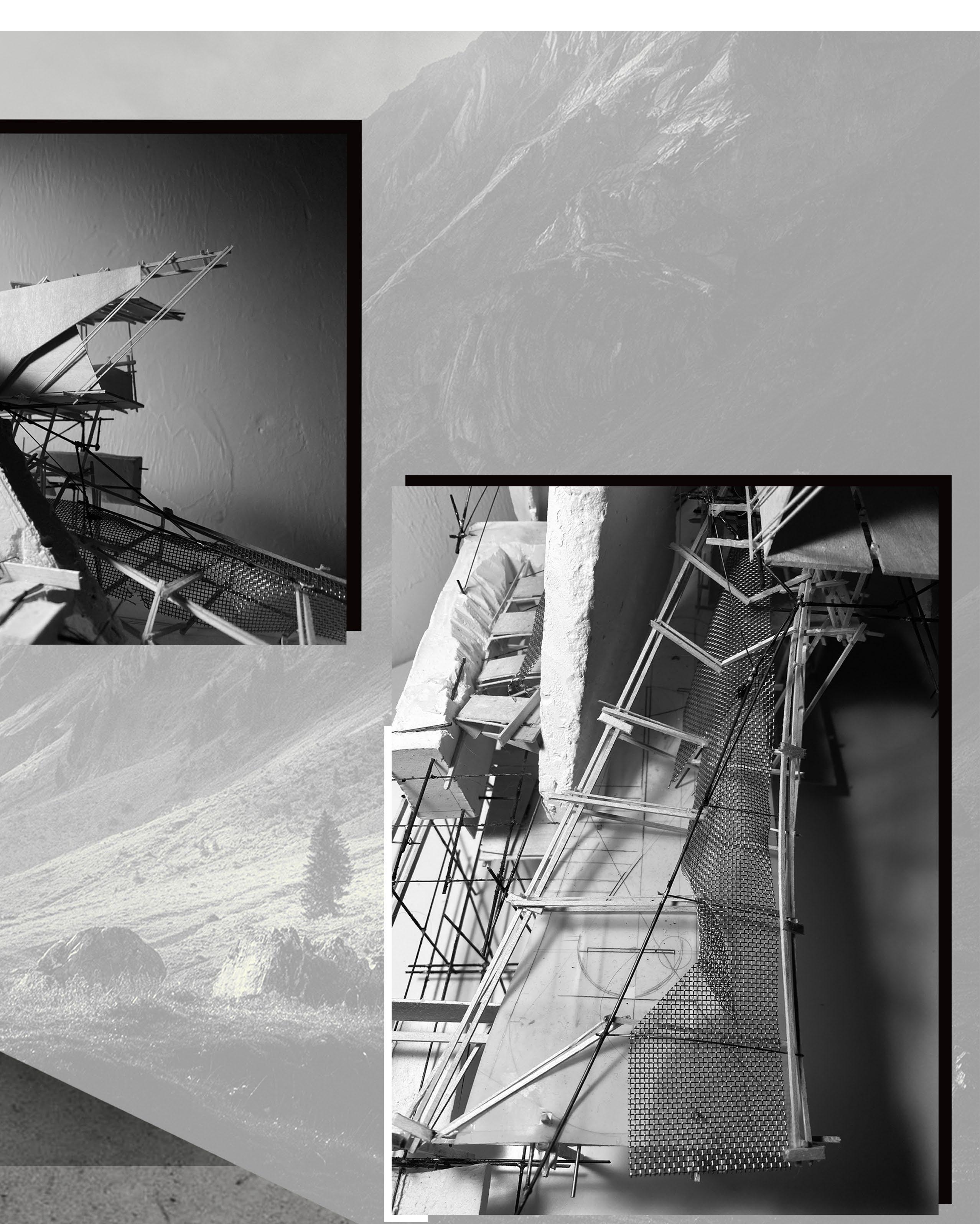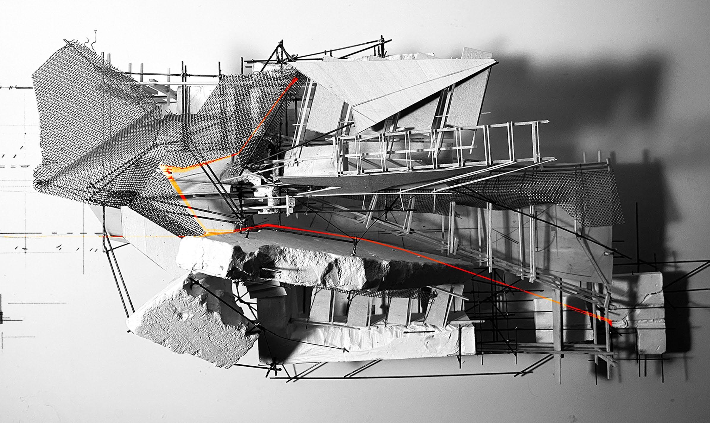 Instead of restoring the cottage to a traditional form, erosion, collapse, and fragmentation generate the new architectural language.