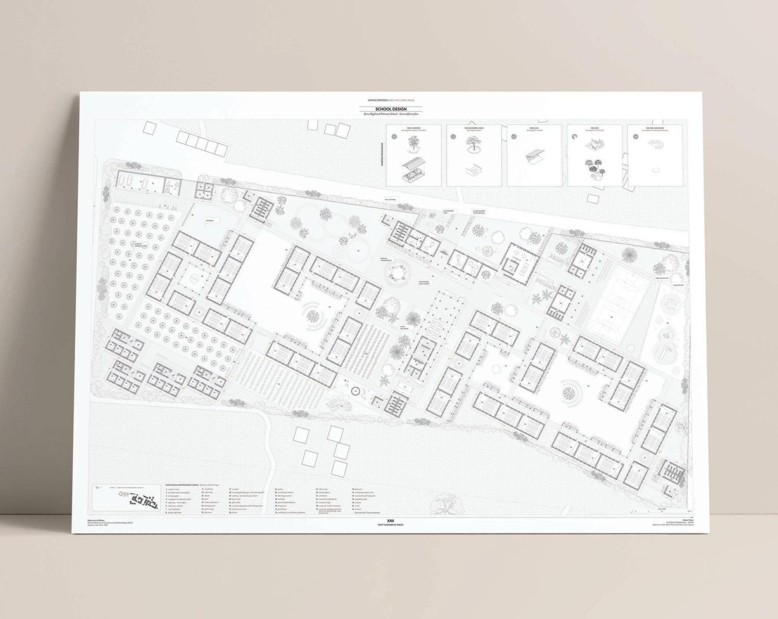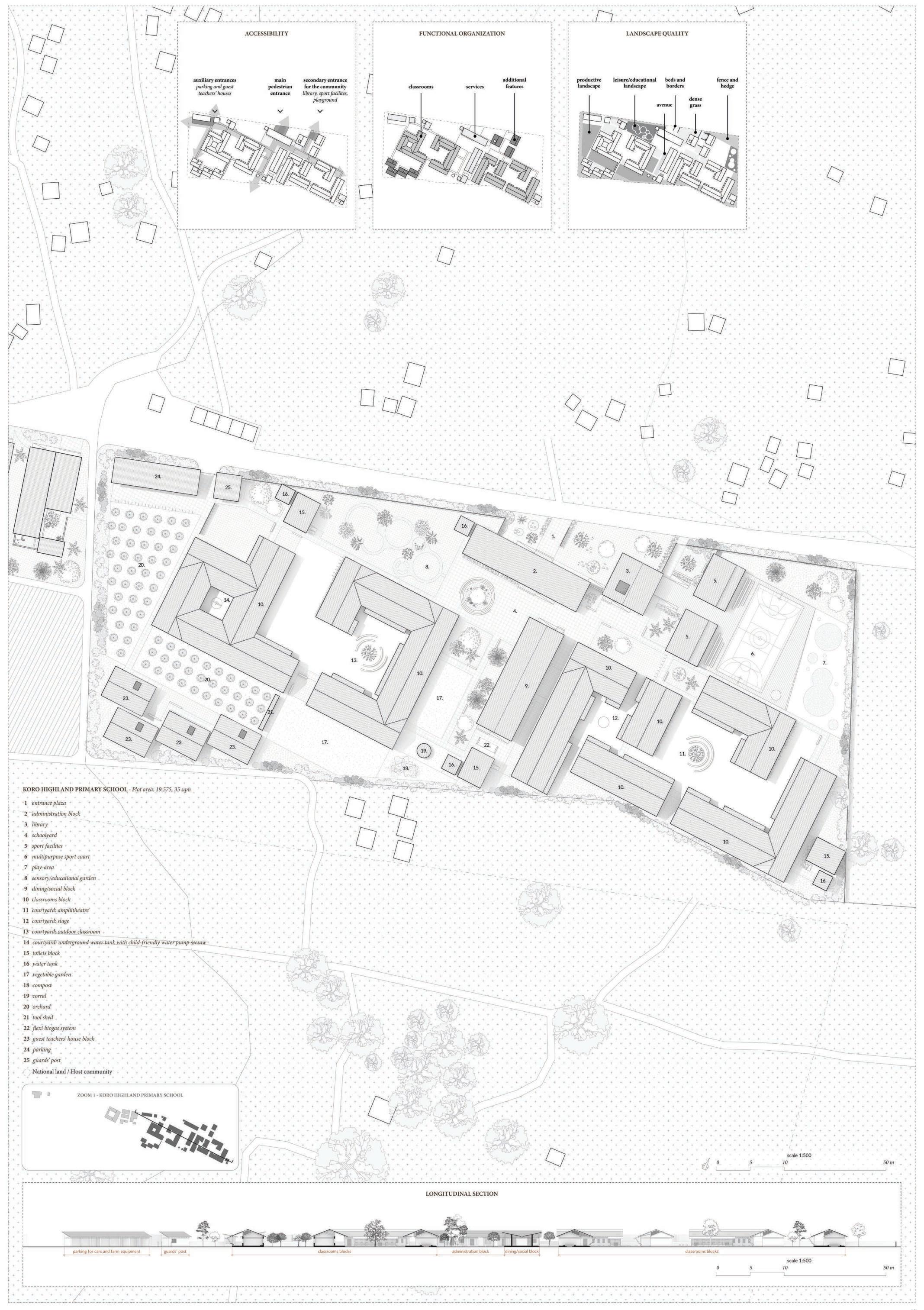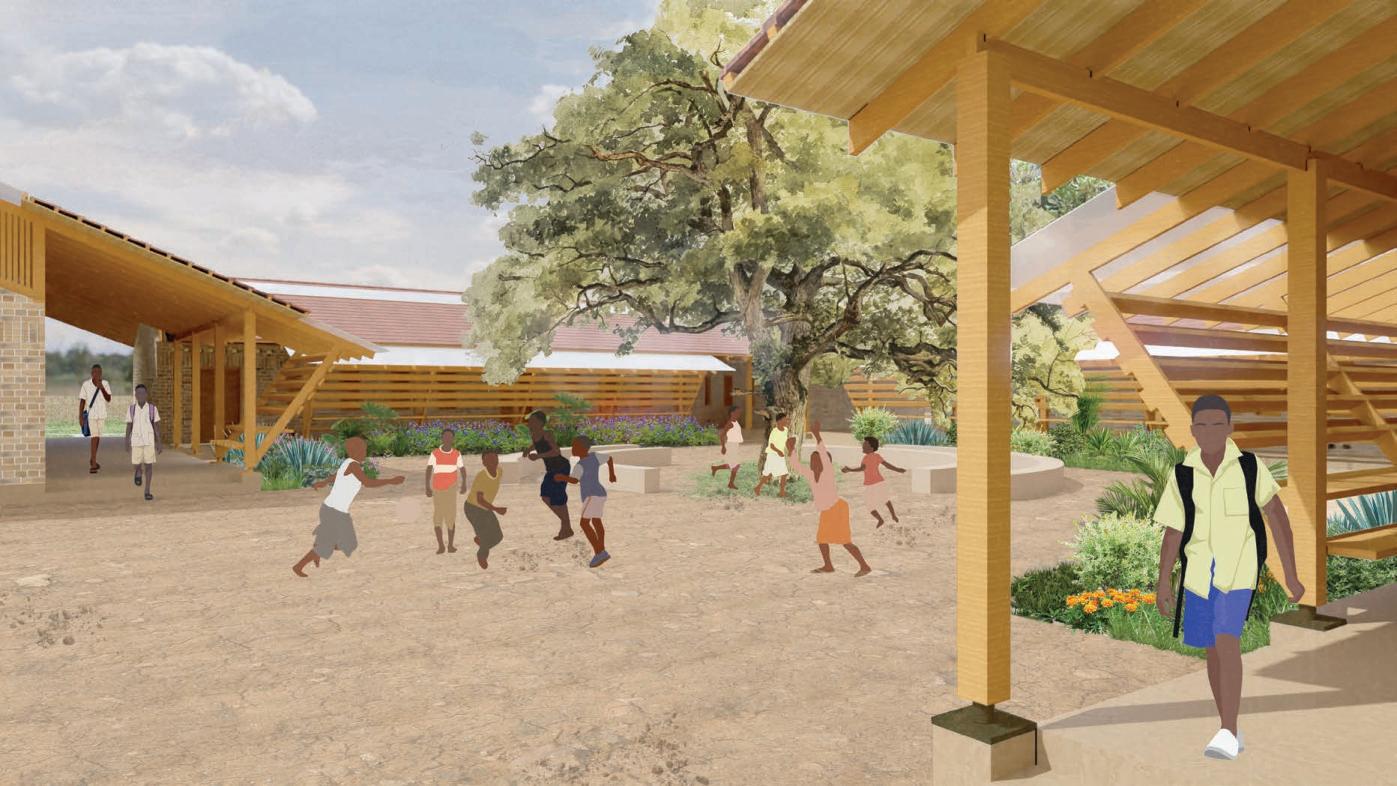 Particolare attenzione è stata dedicata alla progettazione del paesaggio, considerato la chiave per favorire un migliore rapporto tra uomo e natura. Alle spalle di entrambi i complessi scolastici si trovano distese ondulate di specie arboree autoctone alternate a campi dedicati all’agricoltura. Gli alberi esistenti in prossimità delle aree di progetto sono protetti e vengono piantate specie locali per contrastare la crescente deforestazione. Il progetto propone un catalogo di alberi e arbusti utili per l’habitat locale, con l’obiettivo di invertire il degrado del territorio e la povertà attraverso il ripristino del paesaggio. Gli alberi piantati nei giardini e nei complessi scolastici, lungo le strade e nei centri comunitari non solo proteggeranno gli edifci dal caldo sole occidentale, ma forniranno anche nutrimento e fonti sostenibili per una varietà di usi.