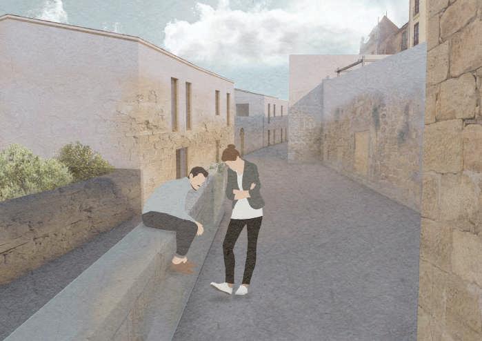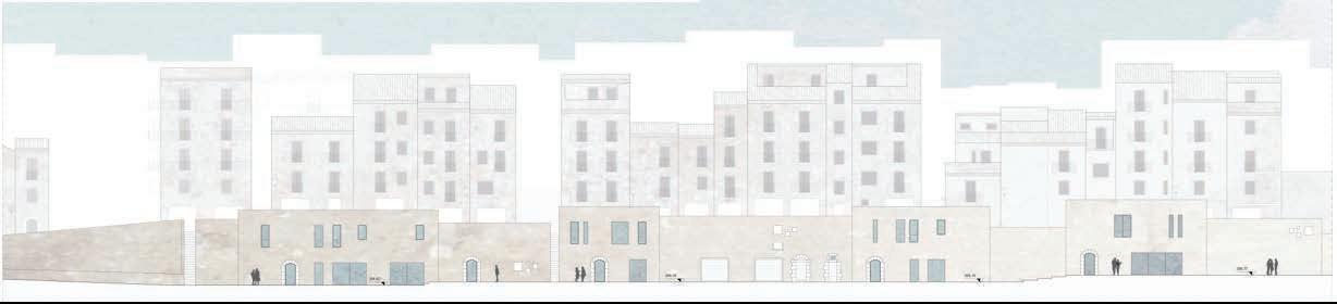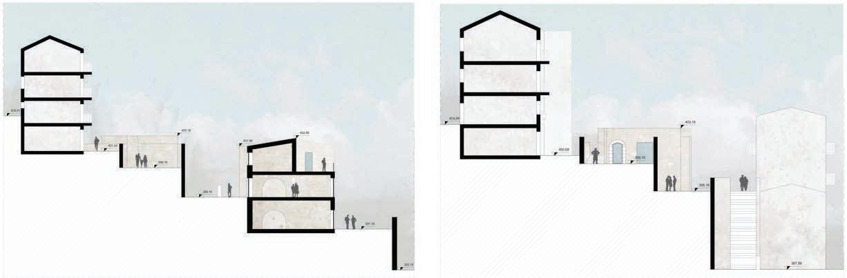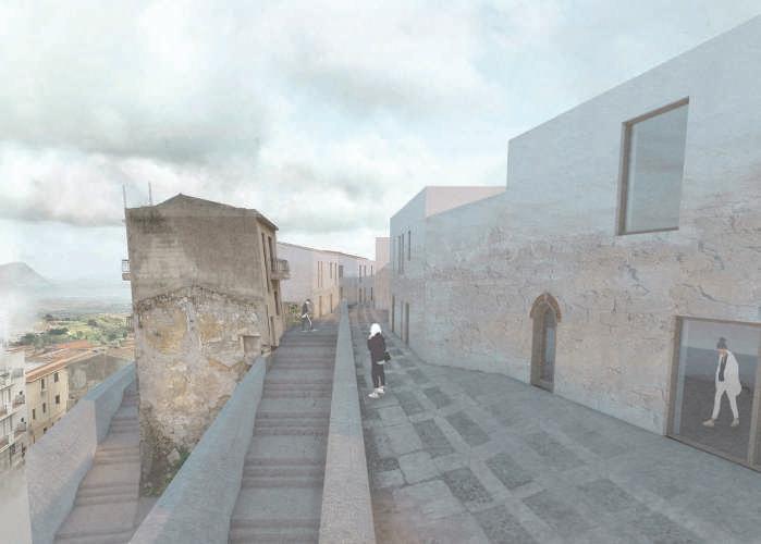 The small town of Salemi is located in the heart of the Belice valley, in western Sicily. After the earthquake, the dramatic urban depopulation did not stop. Hence, the need for an optimistic vision for the urban rebirth of Salemi. This vision will be based on the hypothesis that Salemi could reverse the current trend of urban depopulation, with the arrival in the next 10-15 years of a new population attracted by two factors of development: 1. the migration of cosmopolitan pensioners to small towns and villages in southern Europe, in search of the best places to age in a serene context; 2. the recent development in Sicily of some innovative experiences with young artists and professionals, using culture and creativity to stimulate social regeneration. The project “Street front”, which is the result of individual work, is part of a wider development established in a frst phase of a group project called “Le Terrazze”. The main objective of “Le Terrazze” is to develop a modern community built on the ruins of the old city, without destroying its existing character and pre-existing traditions. The intention is to demonstrate empathy towards the original settlements and the signs of post-earthquake settlements by integrating some of the existing walls and openings, following the existing foundations of the collapsed buildings and renovating the partially damaged buildings at the chosen site. In particular, “Street Front” is focused on the activation of urban passages that bring into play the relationship between the dense urban fabric and the voids left by the ruins. The project is based on this solid-vacuum relationship: following the shape of the old walls and through an alternation of full and empty spaces, a system of buildings was created, interspersed with courtyards on different levels. The project therefore develops not only horizontally, but also vertically, with the aim of recalling the morphology of the terrain of this rather steep area.