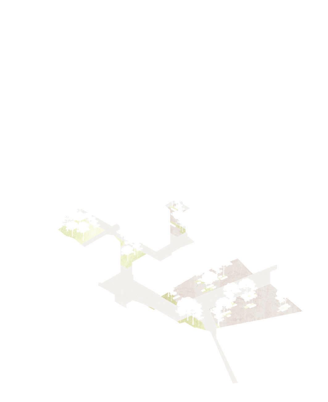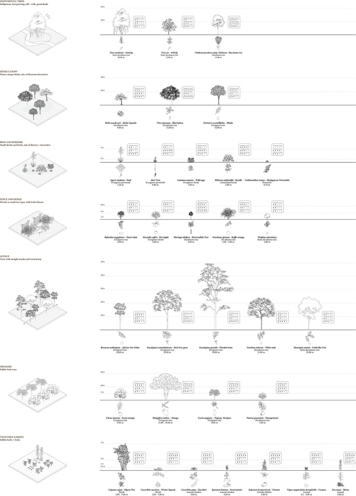 Il concetto di scuola parte da un albero, visto come un rifugio sicuro da condividere, un punto di incontro per l’intera comunità. Il concetto dell’albero è rafforzato dall’analisi dell’ambiente circostante, drammaticamente caratterizzato da fenomeni di deforestazione. 100 anni fa, il 45% del territorio etiope era coperto da foreste, ma oggi questo numero è sceso all’11%, e più precisamente nella regione del Tigray solo l’1% delle foreste è ancora in piedi a causa dell’agricoltura insostenibile, dell’estrazione del legno e della produzione di carbone. WeForest è un’organizzazione internazionale che considera le foreste come risorse naturali a benefcio del clima, dell’ambiente e dell’umanità. Attualmente opera in 3 aree dell’Etiopia e basa il suo lavoro sul ripristino dei terreni degradati coinvolgendo le comunità locali nella coltivazione dei semi. Semi che saranno poi utilizzati per riforestare le aree più svantaggiate. Con l’obiettivo di coinvolgere queste fnalità nella progettazione, il progetto propone una selezione di vegetazione locale che potrebbe essere coltivata all’interno del sito (fungendo da ulteriore programma educativo per i bambini), dalle piante principali agli arbusti e alle specie erbacee, al fne di promuovere lo sviluppo economico all’interno del campo, incrementare la ricarica delle falde acquifere, la sicurezza alimentare e la conoscenza collettiva su un tema diffuso. Questa ricerca ha dato l’opportunità di scegliere la specie arborea principale attorno alla quale ruota il progetto: la Kigelia Africana, chiamata “albero della salsiccia” o “albero della vita” per i suoi ampi benefci. Da questo albero la scuola si propagherà in una serie di spazi pubblici e privati da cui i rifugiati Mai Aini ca inizieranno a ricostruire una nuova comunità.