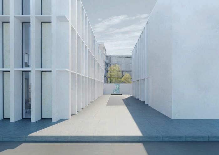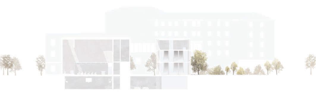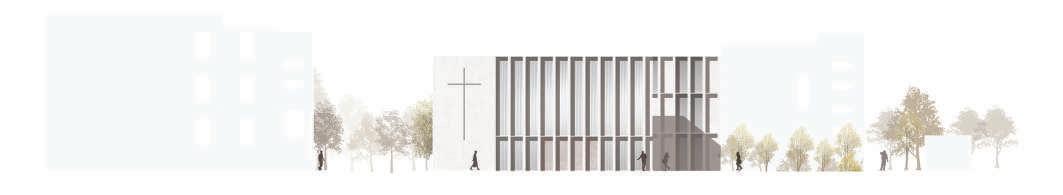 In Itinere literally means during the journey. The project is a journey through spaces with different atmospheres, lights and dimensions. This complex of the Catholic Church wants to be conceived not only as a solitary place of worship of God, but also as a place of socialization and inclusion, a place in which to know oneself and others. For this reason, the space of worship becomes a space for the entire Piola community: a space capable of giving voice to different voices. The community building includes offces at the ground foor and a small bar/cafeteria to give direct access to the large courtyard at the back of the plot. This space will enrich not only the quality of life of the people directly linked to the ecclesiastical complex but also of the University. The parvis space is a narrow courtyard, between the above mentioned building and the church, protected from external interference. It is a slow, calm and harmonious space that aims to prepare the faithful to enter the church. Entering the space of the church you feel overwhelmed by the solemn light, which hits the ground in strips because of the structural system of the pillars. The layout of the church resembles that of the traditional church, characterized by a central nave and side aisles overlooking the apse. The choir space is located just above the entrance to prepare the faithful for the intensity of the church space, which is twelve metres high. The transept is created by the axis of connection with the weekdays chapel. The two unique but connected volumes speak the same architectural language. This language unifes the entire complex, despite the differences that characterize each of the buildings. The large cross-shaped window that illuminates the weekdays chapel creates an atmosphere that is completely different from the main nave: dark and intense, promoting interior contemplation.