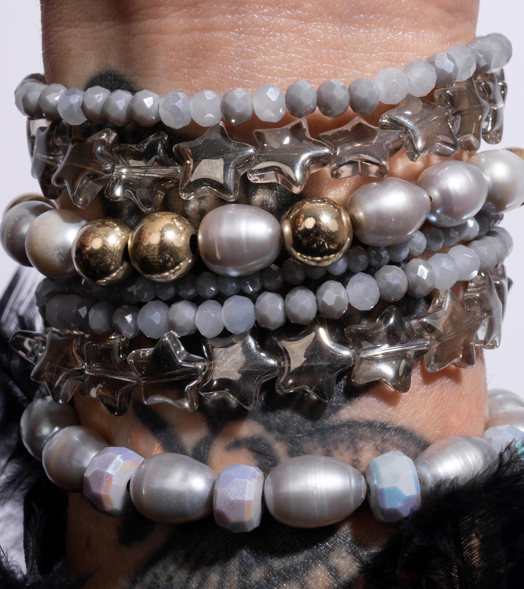 POLISHED EDGE 7MM JUMBO WHITE CRYSTAL + 8MM JUMBO STERLING SILVER + YELLOW GOLD FILL BEADS CLASSIC CADENCE 7MM JUMBO GRAY FRESHWATER PEARL + 8MM YELLOW GOLD FILL BEADS FULL CIRCLE