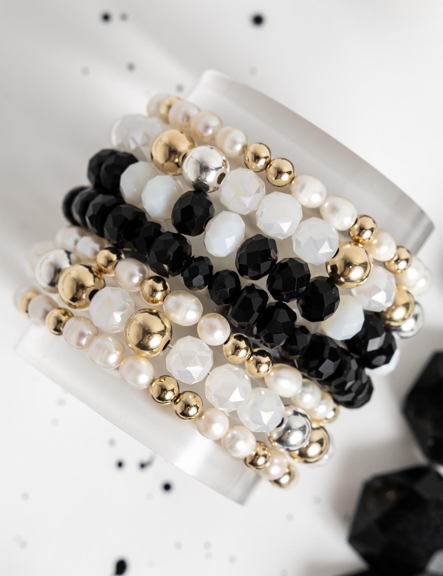 POLISHED EDGE 7MM JUMBO WHITE CRYSTAL + 8MM JUMBO STERLING SILVER + YELLOW GOLD FILL BEADS SOIRÉE 6MM + 8MM JUMBO BLACK