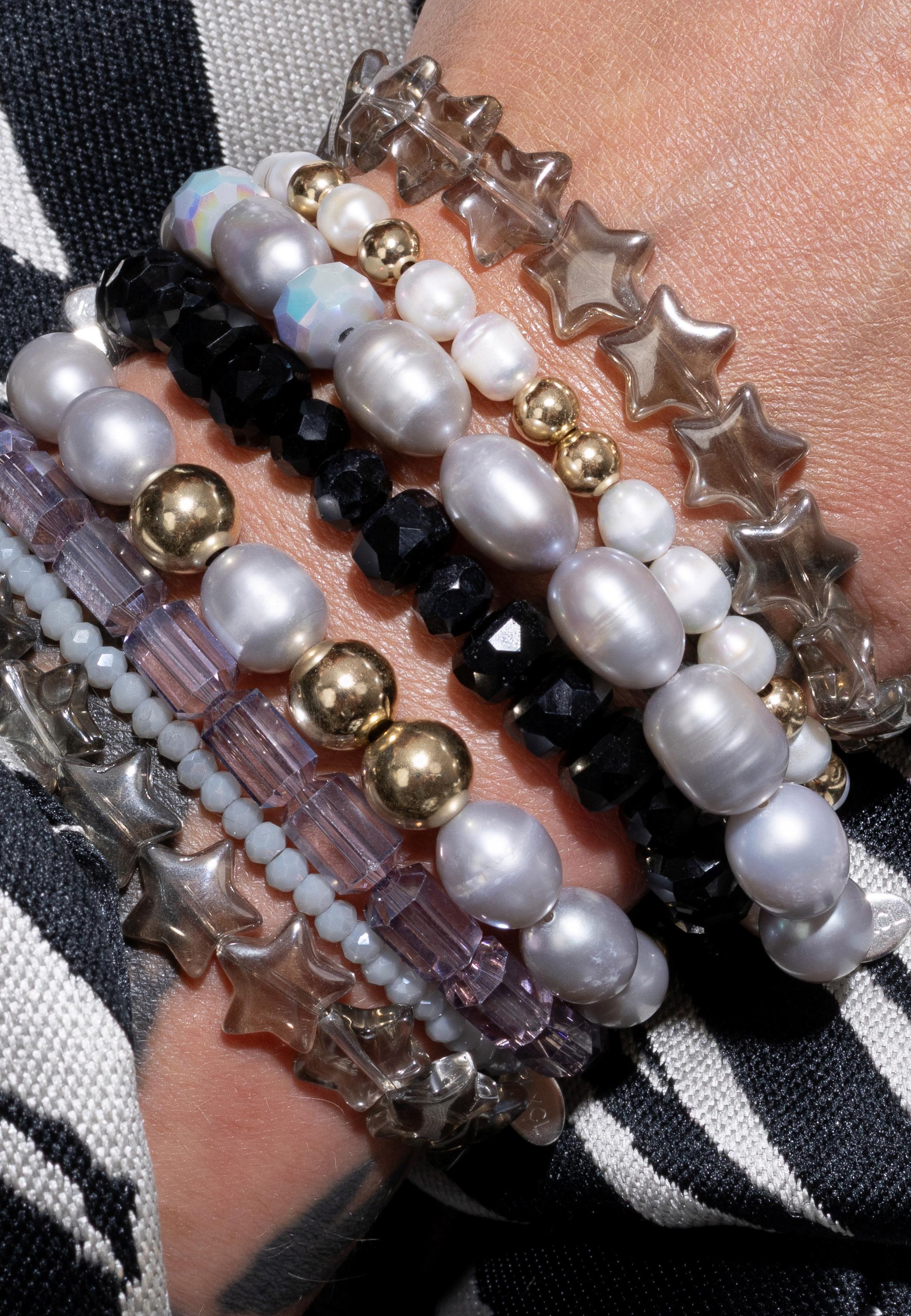 CRYSTAL CAVIAR AND CRYSTAL 4MM BLUE + GRAY CRYSTAL TAILORED BRILLIANCE 5MM FRESHWATER PEARL + YELLOW GOLD FILL BEADS MANHATTAN MUSE 8MM JUMBO BLACK + WHITE CRYSTAL