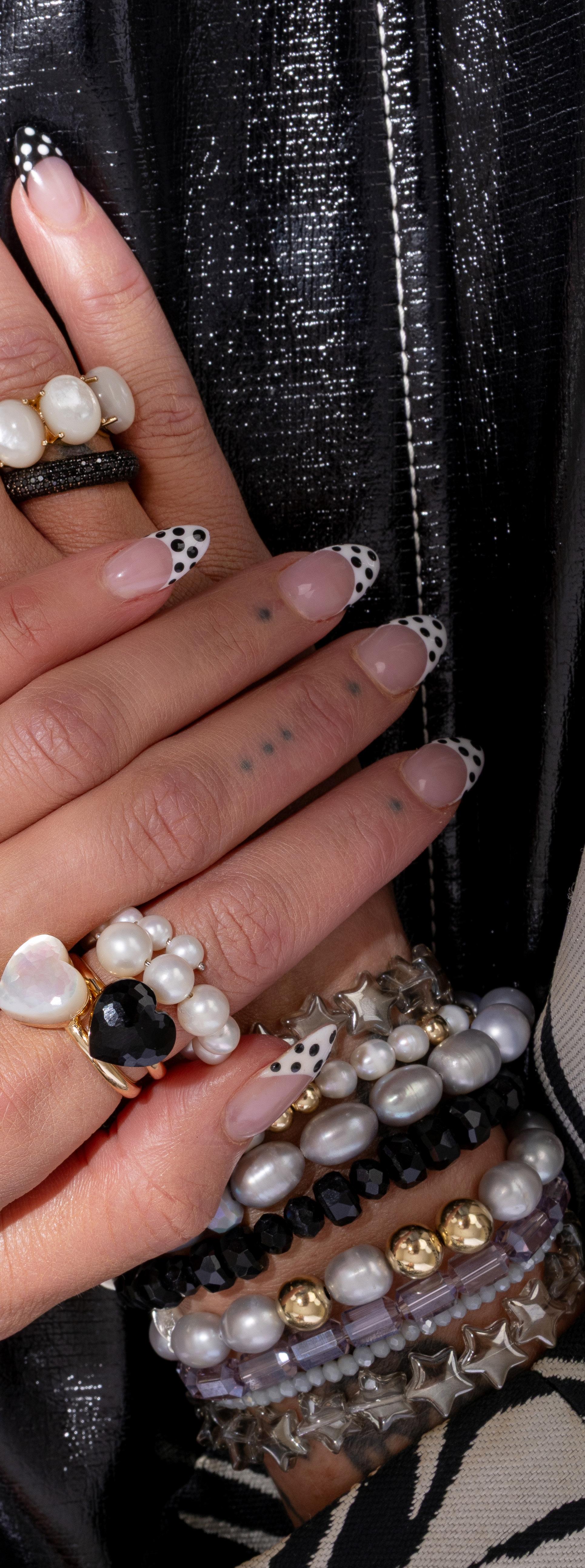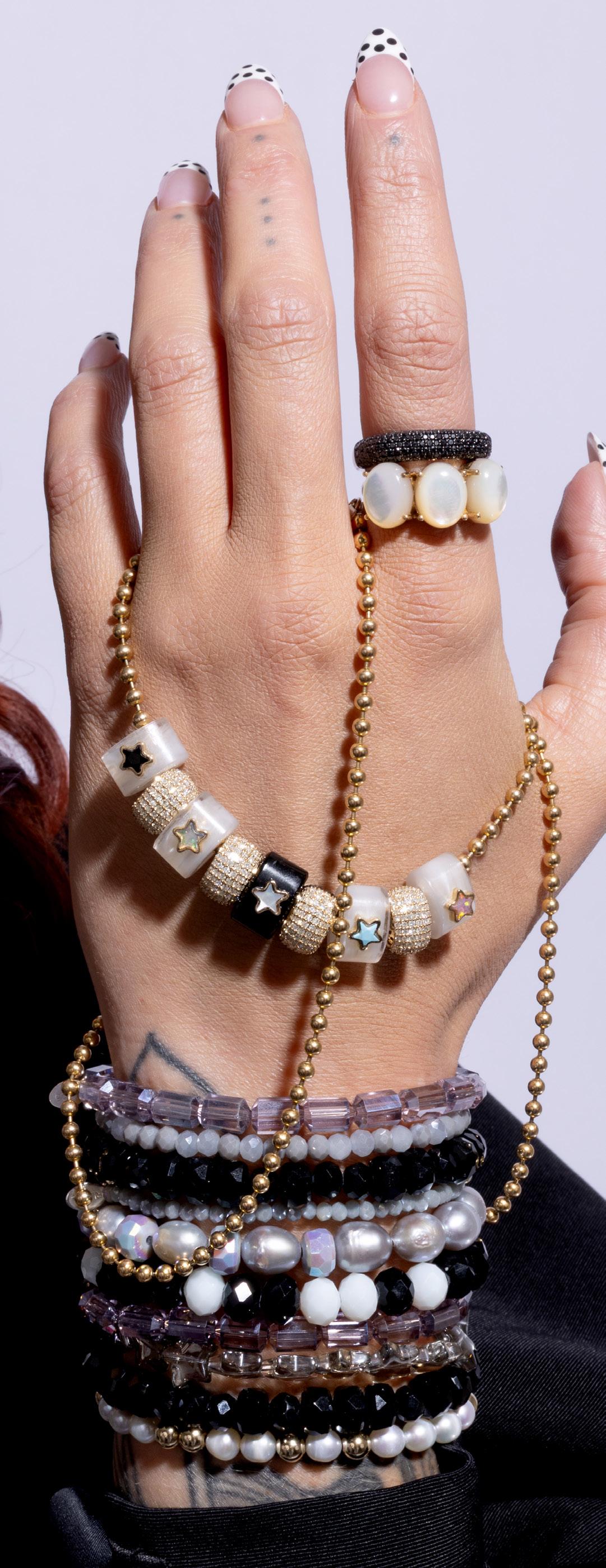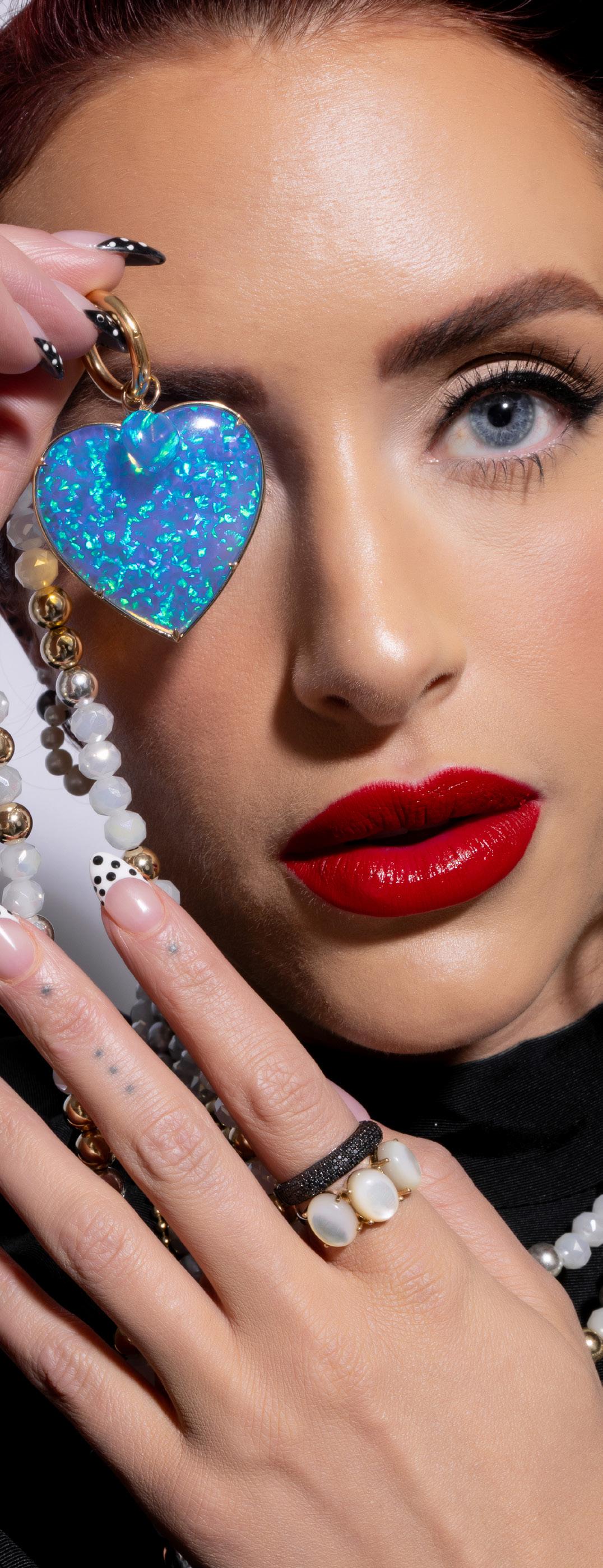 BEZEL SET PONY BEADS | MOTHER OF PEARL BEZEL SET WITH TEAL FIRE OPAL, BLACK ONYX, PINK FIRE OPAL OR TURQUOISE | BLACK ONYX BEZEL SET WITH MOTHER OF PEARL EXPRESS YOURSELF 14K YELLOW GOLD PAVÉ HALF WHITE + BLACK DIAMOND SPACER STATEMENT PIECE 14K YELLOW GOLD + TEAL FIRE OPAL JUMBO HEART PENDANT MICRO BUBBLE 14K YELLOW GOLD + TEAL FIRE OPAL