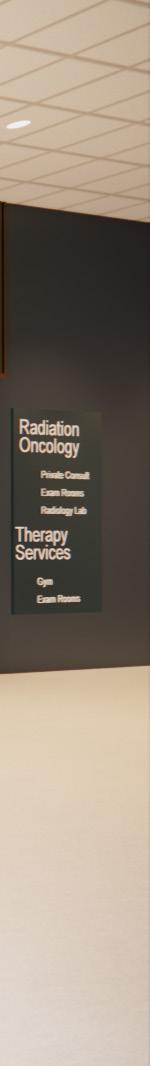 Staff spaces are centrally located for ease of access to patients. Medical and Radiation Oncology are separated for less confusion with the caregiver spaces connected with a back hallway.