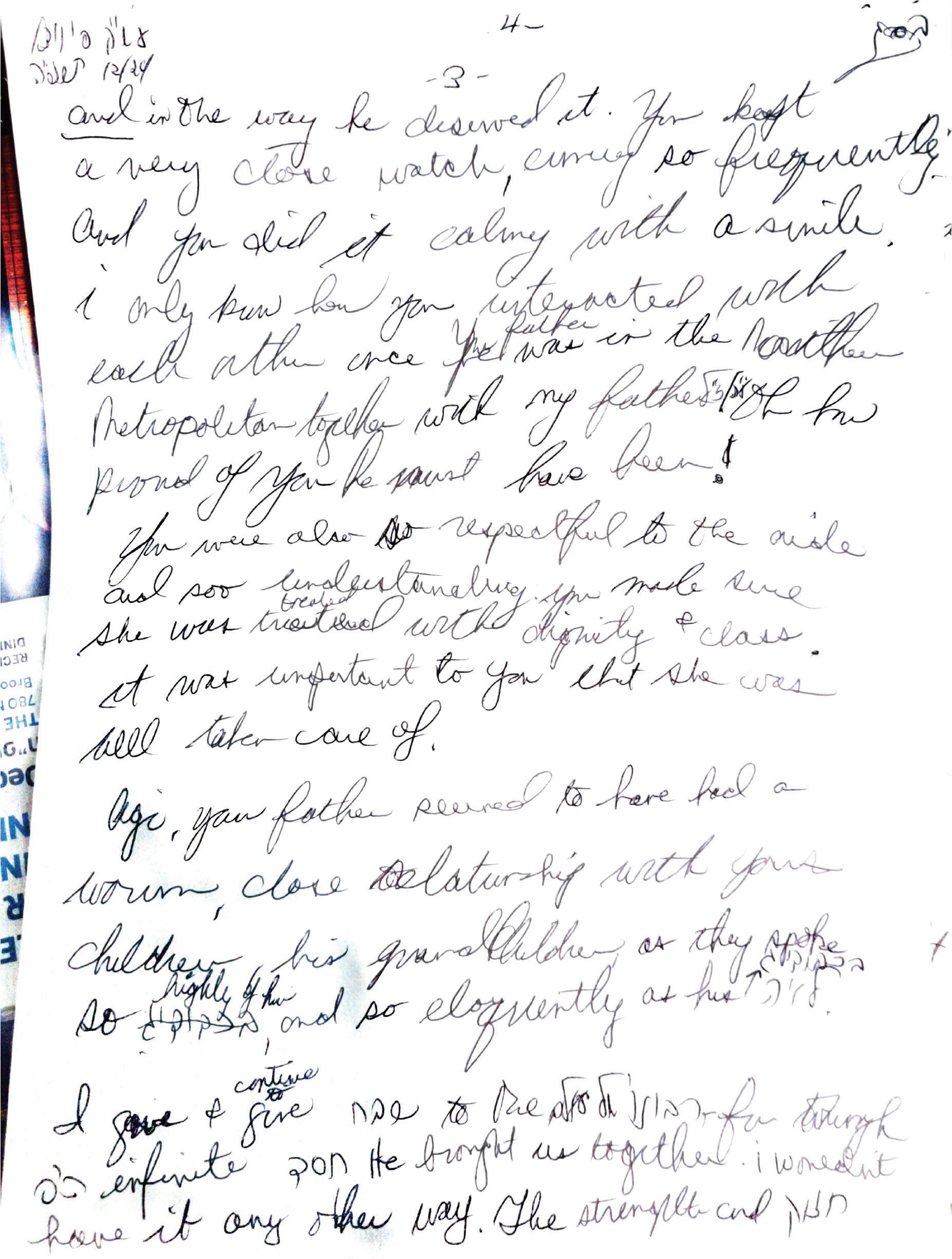 Chavie, the daughter of Rabbi Klein, who had been my father's roommate in Metropolitan, came to the shiva. I would like to share with you the personal letter that she sent to me, which was so meaningful. She expressed her feelings towards my father and to me, as well. I was full of emotion as I read it. The letter is framed, and I keep it on my dining room buffet. Many years have passed and I'm still in touch with her. Her words never left me.