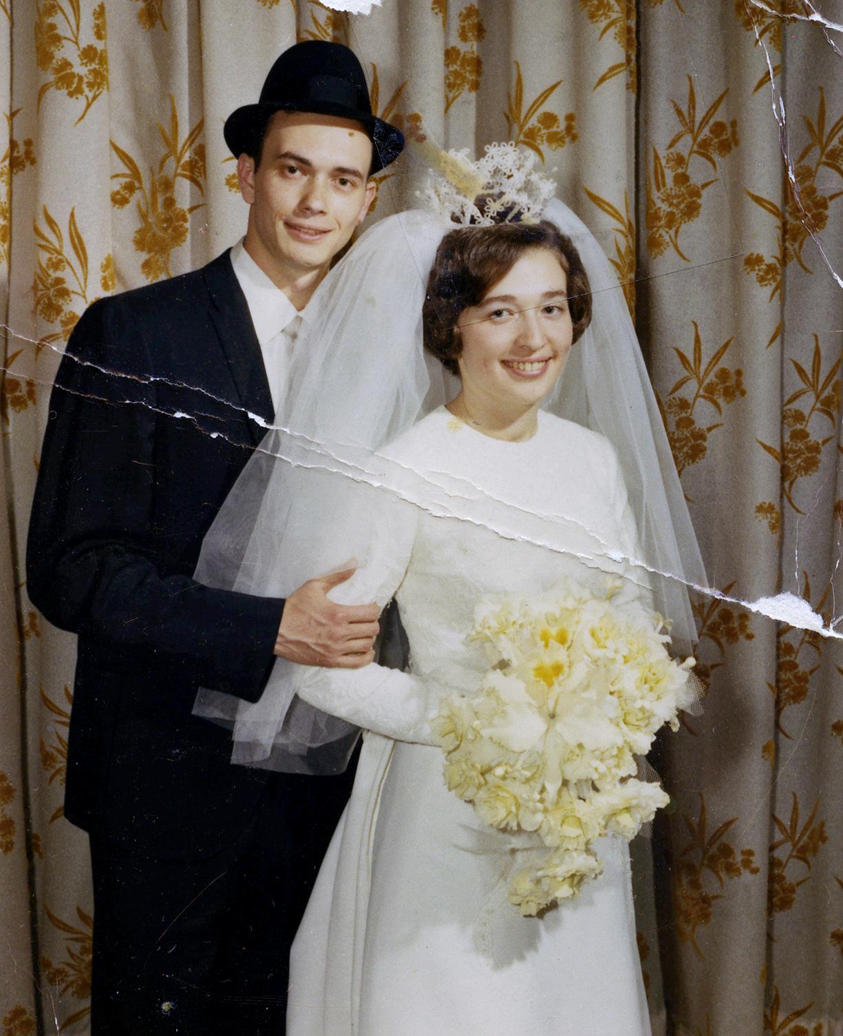 We were married on October 16, 1966, at Menorah Temple in Boro Park. I bought my gown at A & S Department store, and it was worn by other kallahs after my wedding. I had a veil and a crown that were custom made. I kept them as a remembrance. Harry Trainer was our photographer,
