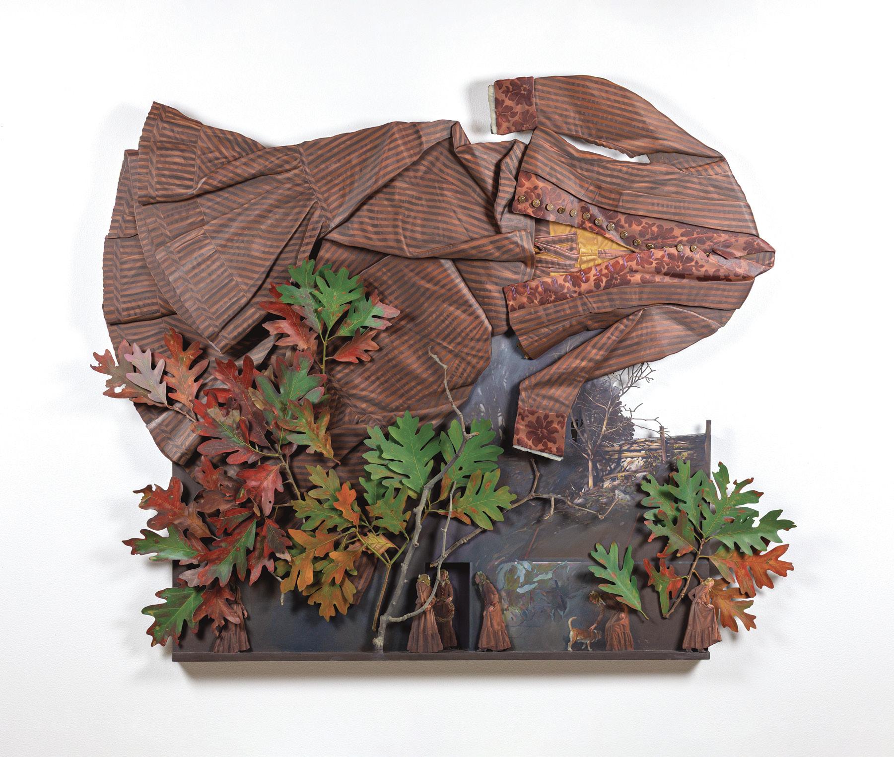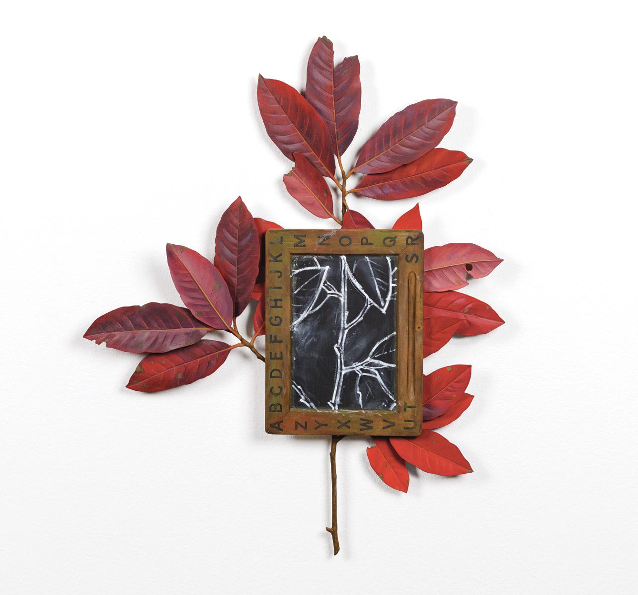 Trompe l’oeil artwork is regarded by some as the manipulation of materials with highly technical skill. In addition, there is a kind of humor implicit in the object’s creation—knowing that the viewer will likely have a moment of surprise or disbelief. Three-dimensional explorations of illusion have often included suggesting one material through another. Isaacs does this as he convincingly makes wood and paint appear to be fabric, plant matter, and numerous other things. Isaacs also layers ideas, and realities, as he combines illusionistic imagery with surreal set-ups, such as in Metaphor (fig 4) where torsos—one skeletal and one a suit jacket—seem to be made of branches and leaves that also appear animated even though they are disembodied. Similarly, the dress of The Sassafras Baby (fig 5) seems to be either forming from or dissolving into a sketch on a blackboard framed in leaves. Where does illusion end and reality begin? And vice versa?