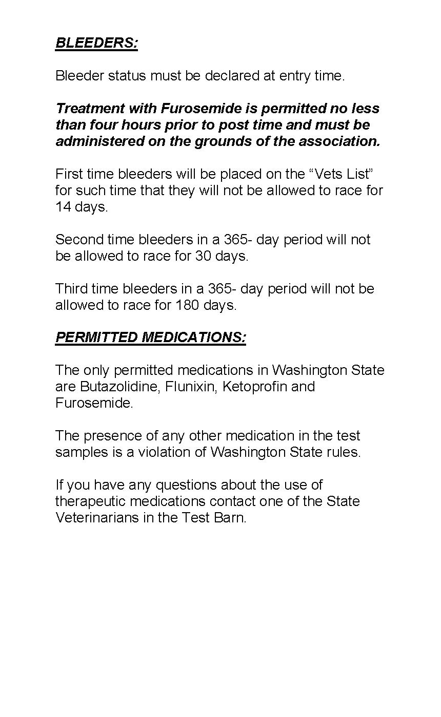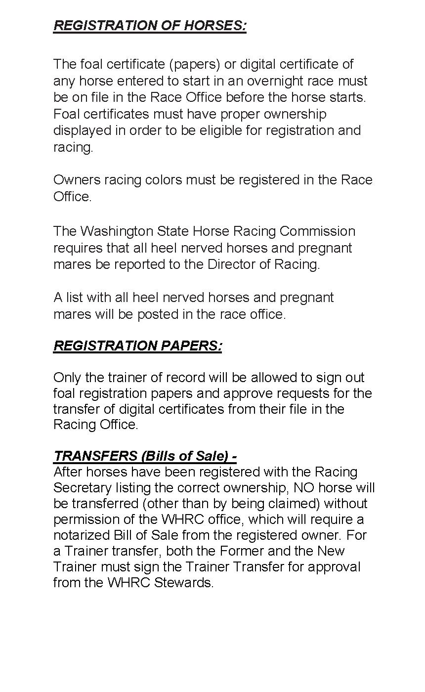 The rules of racing adopted by the Washington State Horse Racing Commission in effect at the actual time of the running of the race, govern all races run at this course.