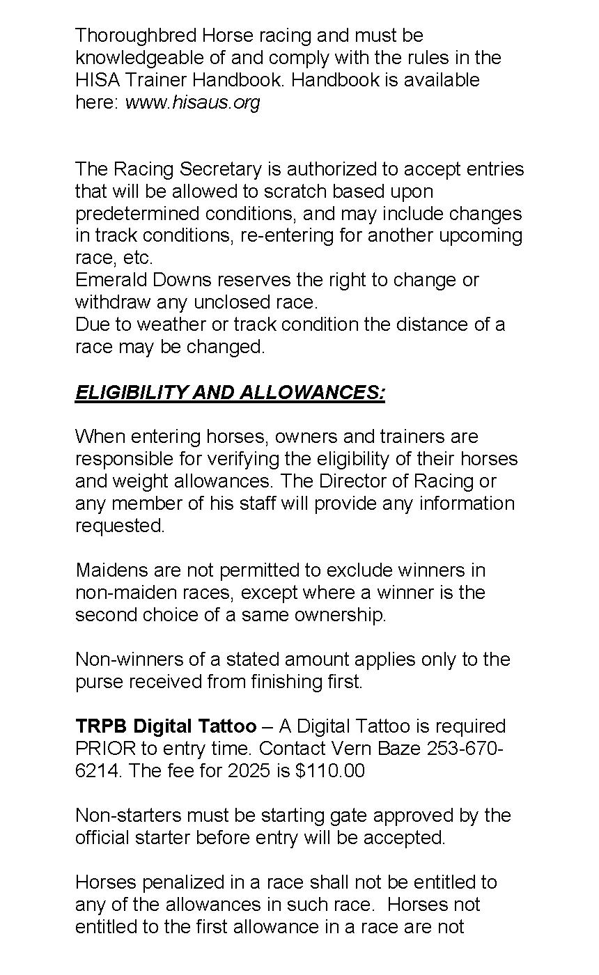 • The owner(s) must be WTBOA members prior to Emerald Downs’ opening day of the year in which the bonus is paid. A horse that is managed by a WTBOA member will also receive the award. For instance, if a racing partnership or syndicate owns the horse, as long as the person who manages the entity is a member, they will receive the bonus.