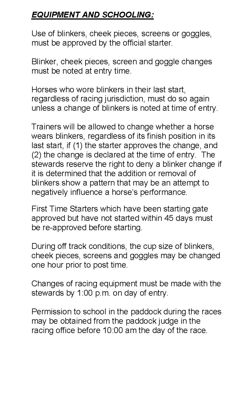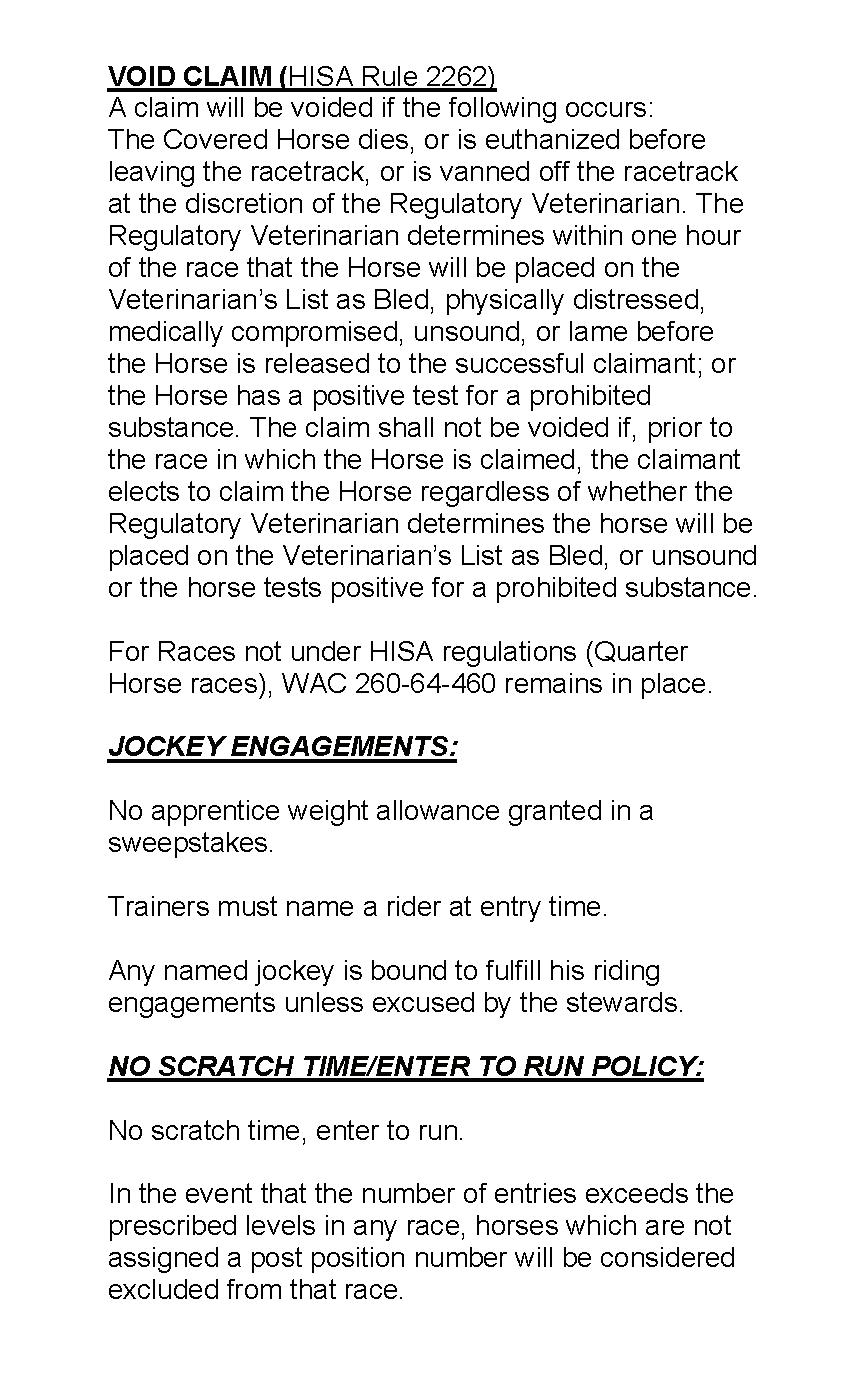 The rules of racing adopted by the Washington State Horse Racing Commission in effect at the actual time of the running of the race, govern all races run at this course.