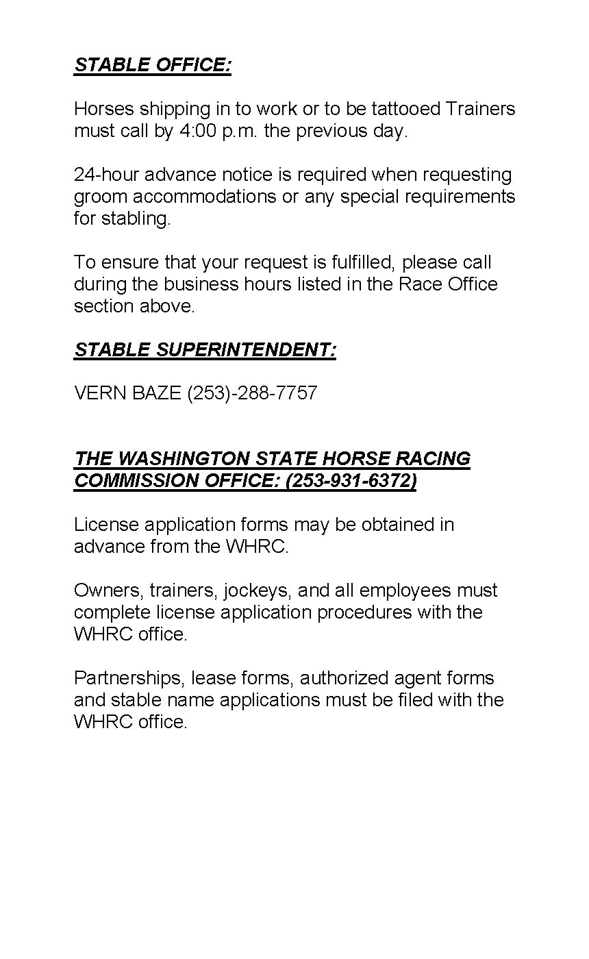 Assistance for Horsemen on Race Day, Licensing, Guest Passes, Reservations for Dining, Box Seats and Hotels (253) 288-7753