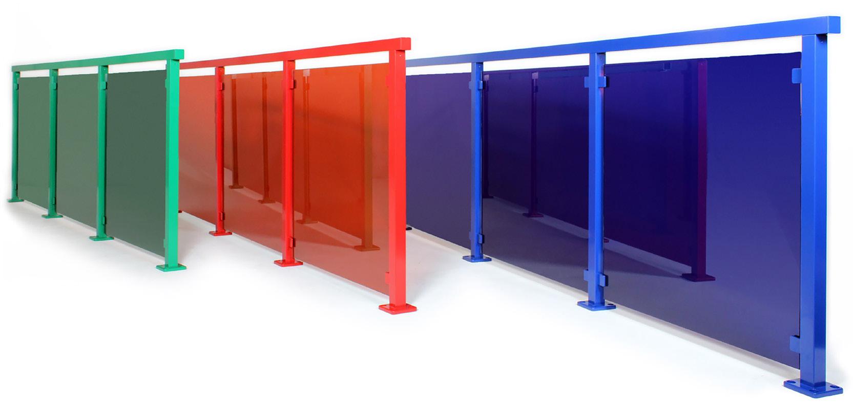 Utifrån RAL-systemet, ett brett spektrum av färger. Kan du välja vilken färg du önskar. Välj att designa hela räcket i samma färg, eller välj en färg till stoplarna, en till glasen, ytterligare en till överliggaren och en sista färg på klämfästena - valet är helt och hållet ditt.