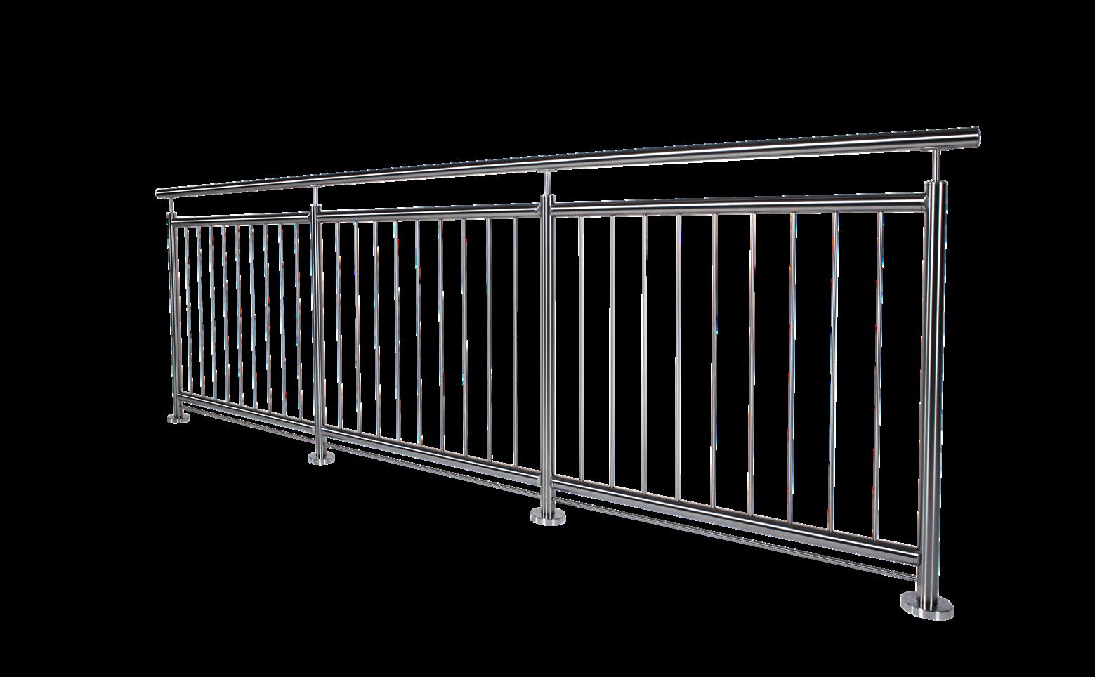 Rostfritt räcke med vertikala stänger har alltid en överliggare Stängerna är runda med en diameter på 12 mm