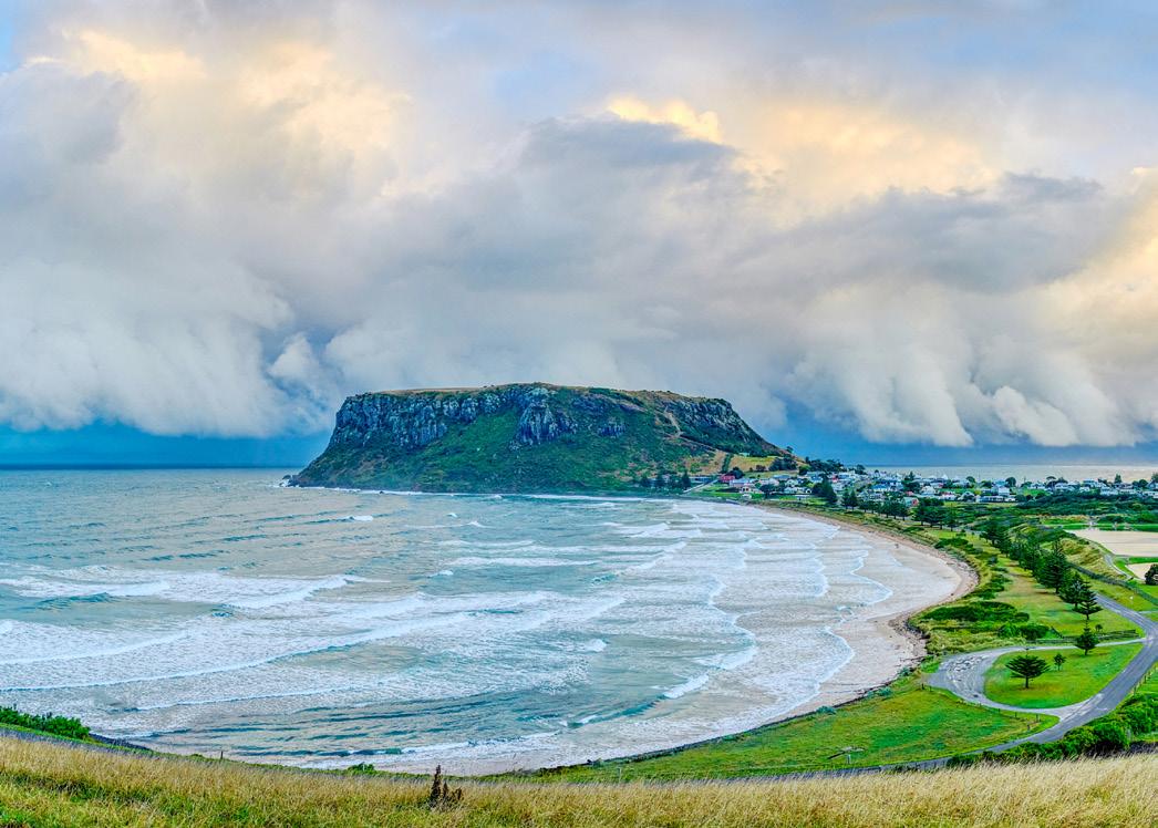 CLOCKWISE FROM TOP // John Hewitt was in the right spot to photograph this giant storm cloud over the Nut at Stanley; Pirates Bay on the Tasman Peninsula by Julian Witek; Leeola Hepher captured the dazzling lights and Bicheno Beams; Azra-Lee Beach snapped this shot at Lilydale Falls.