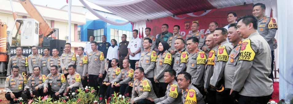 Bogor. Hadir Kapolres Bogor, AKBP Rio Wahyu Anggoro, Pj Bupati Asmawa Tosepu, Ketua DPRD Rudy Susmanto beserta kapolsek se-Kabupaten Bogor foto bersama usai simbolis peletakan batu pertama pembangunan Gedung Pelayanan serta Rusun Polres Bogor, Cibinong, Jawa Barat.(*mer/b)