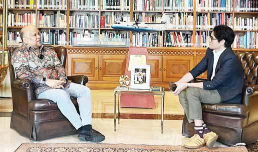 BICARA JAWA BARAT: Bakal Calon Gubernur Jawa Barat Ilham Akbar Habibie (kiri) saat berbincang dengan Pemimpin Redaksi Radar Bogor Ricki Noor Rachman di Wisma Habibie–Ainun, kawasan