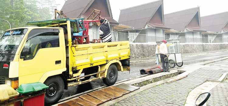 Pedagang mengangkut dan membawa barangbarang untuk berjualan ke kios di Rest Area Gunung Mas Puncak, Kamis (27/6).