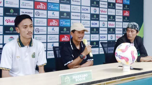 MUNDUR: Djadjang Nurdjaman (tengah) memberikan keterangan kepada awak media usai Persikabo menghadapi PSKC Cimahi di Stadion Pakansari,