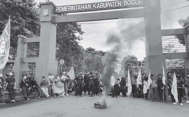 aksi unjuk rasa di depan kantor Pemerintah Kabupaten Bogor menuntut PJ Bupati Bogor segera membuat surat rekomendasi dan memperjuangkan kesetaraan kenaikan bagi pekerja upah minimum sektoral Kabupaten (UMSK).