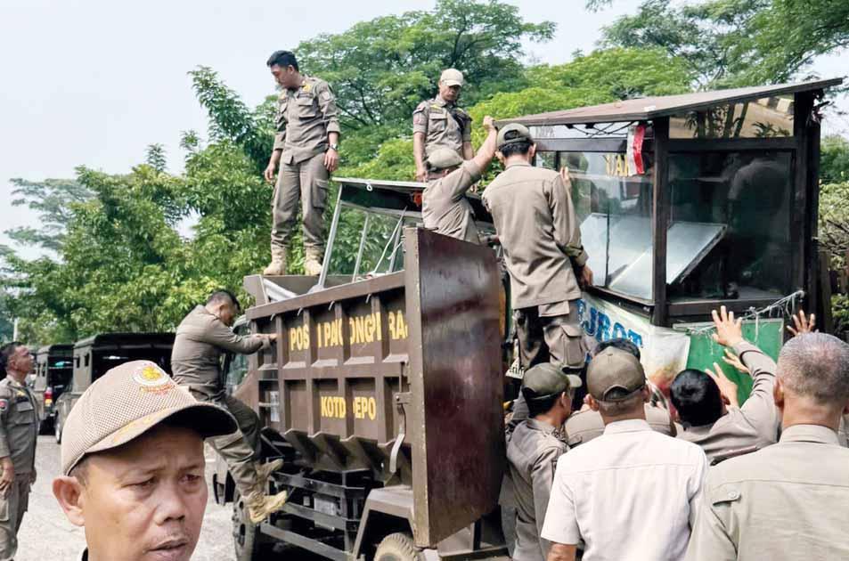 DEPOK–Satuan Polisi Pamong Praja (Satpol PP) Kota Depok kembali bongkar paksa lapak pedagang kaki lima (PKL) yang berjualan di sepanjang Jalan Raya Boulevard Grand Depok City (GDC), Kelurahan Tirtajaya, Kecamatan Sukmajaya, serta di Kelurahan Jatimulya, Kecamatan Cilodong, Rabu (17/9) kemarin.