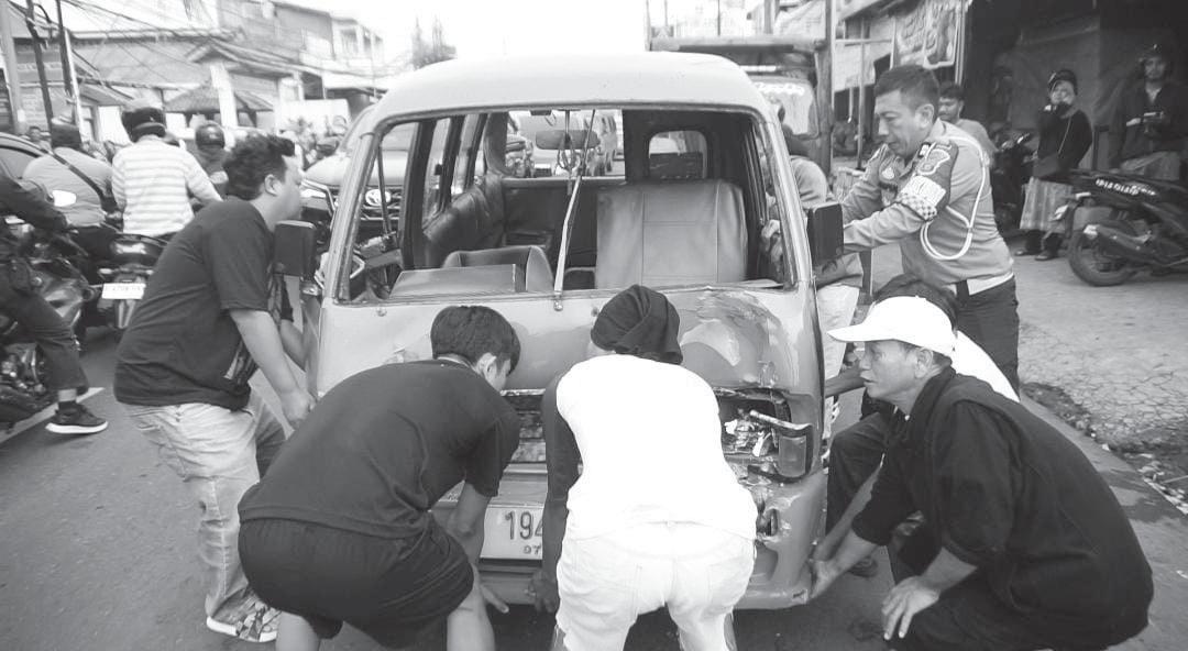 TABRAKAN: Petugas bersama warga saat mengevakuasi satu unit angkot alami kerusakan cukup parah akibat terlibat kecelakaan lalu lintas di Cileungsi.