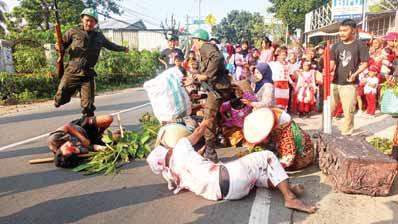PERTUNJUKKAN itu dipersembahkan warga untuk mengenang jasa para pahlawan. Utamanya saat mengusir bangsa Belanda dan Jepang yang telah menjajah. Aksi teatrikal ini diperankan oleh para pemuda di RT 03 RW 07, Kelurahan Pondok Rajeg. Aksi itu berlangsung berbarengan dengan acara pawai busana dan kostum. Seksi acara Karang Taruna RT 03 RW 07, Kelurahan Pondok Rajeg, Andra mengatakan pawai yang dilaksanakan HUT ke-80 RI itu memang bertemakan perjuangan masyarakat Indonesia dalam melawan penjajah pada masa lalu. ”Ini perjuangan masa pen-