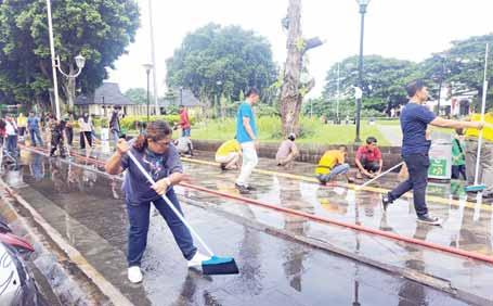 BERSIH-BERSIH: Wakil Wali Kota Bogor Jenal Mutaqin bersama puluhan perserta Padat Karya membersihkan Alun-Alun Kota Bogor pada Jumat