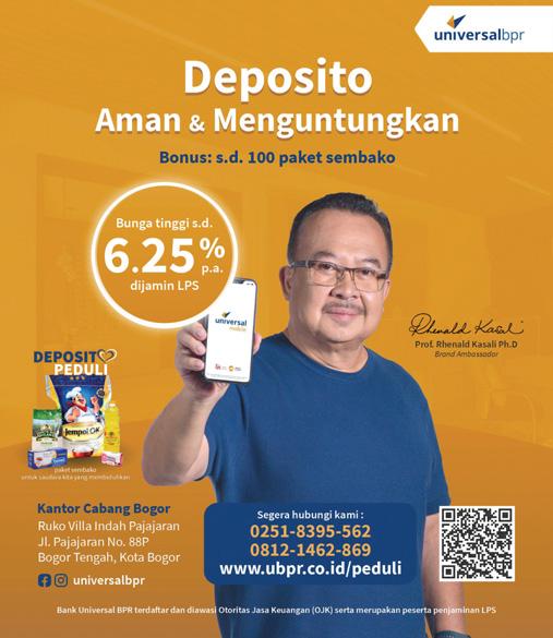 RADAR BOGOR Direktur Utama: Hazairin Sitepu General Manager Bisnis: Nihrawati AS Pemimpin/Penanggungjawab Redaksi: Ricki Noor Rachman Wakil Pemimpin/Penanggungjawab Redaksi: M.Indra Dewan Redaksi: Andi Ahmadi, Faturahman S Kanday, Nihrawati AS Redaktur Pelaksana Online: Yosep Awaludin Redaktur Senior: Muhammad Ridwan, Muh Afandi Iqbal Muhammad, Lucky Lukman Nul Hakim Redaktur: Pipin Apriani, Alpin, Muhammad Ruri Ariatullah, Rani Puspitasari Sinaga Sekretaris Redaksi: Mia Muliawan Reporter: Jaenal Abidin, Arif Al Fajar, Dede Supriadi, Imam Rahmanto, Septi Nulawam Harahap Fotografer: Sofyansyah, Hendi Novian Konten Kreatif: Kintan Madinatul Editor Video: M. Azirul Fariq Videografer: M. Rivaldi Desain Grafis: Alfi Pracetak: Zainal Arifin (Koordinator) Teknologi Informasi (IT): Beni Irawan (General Manager) Umum dan Personalia: Rawin Surwintono Iklan: Erwin Sofian (Manager), Untung Bachtiar (Asist. Manager) Pemasaran dan Sirkulasi: M Iksan Halil (Manager), Omer Ritonga Digital Marketing: Recia Debora S Konsultan Hukum: Andi Syarifuddin SH, MH Ombudsman: M. Choirul Shodiq, Rohman Budijanto Penerbit: PT Bogor Ekspres Media. SIUPP: 651/SK/MENPEN/SIUPP/28 Oktober 1998 Percetakan: PT Bogor Media Grafika (Jalan Siliwangi Kav.1/34 Komp. Puslitbang KOSTRAD Desa Cijujung Kandang Roda Bogor Telp: 0251 8655965) Alamat: Graha Pena Radar Bogor, Jl KHR Abdullah Bin Muh Nuh No 30 Taman Yasmin Bogor 16113. Telepon Redaksi: 0251-7544005 (hunting), Fax:251-7544008. Telepon Iklan: 0251-7544001-002, Fax: 0251-7544009. Telepon Pemasaran: 0251-7544003. Perwakilan Jakarta: Gedung Graha Pena, Jl Kebayoran Lama 12 Jakarta Selatan, Telepon/Fax: 021-53699624. Homepage: http//www.radarbogor.id Email: redaksi@ radar-bogor.com. Harga Langganan: Rp 80.000. Wartawan Radar Bogor dilarang menerima uang maupun barang dari sumber berita. Wartawan Radar Bogor dibekali dengan kartu pers yang selalu dikenakan selama bertugas.