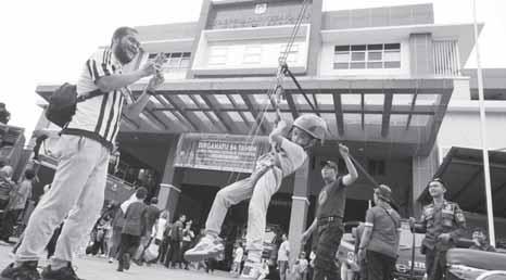 MELUNCUR: Seorang anak bermain flying fox, wahana yang disediakan Dinas Pemadam Kebakaran Kabupaten Bogor, Minggu (16/11/2025).