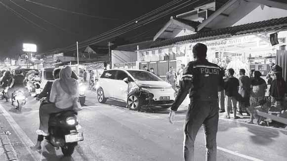 pada awak media. Akibatnya dua kendaran tersebut berbenturan. Motor yang berada percis di belakang mobil hitam juga kena imbasnya. Kendaraan beroda dua itupun mengalami kerusakan di bagian depan. “Jadi kalau si motor ini ada di belakang mobil hitam. Pas mobil berbenturan si mo tor ini nabrak. Jadi kaya beruntun gitu. Benturannya cukup keras,” ujar Aldi, Kamis (16/10) malam. Aldi menerangkan pengendara mobil hitam mengalami luka di bagian kepalanya. Dirinya pun sampai dibawa menggunakan ambulans menuju rumah sakit terdekat. Peristiwa ini sempat berdampak pada situasi arus lalu lintas. Antrean kendaraan nampak terjadi. Baik yang