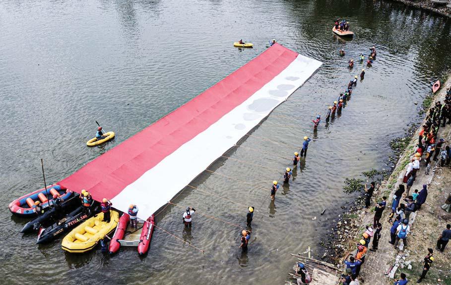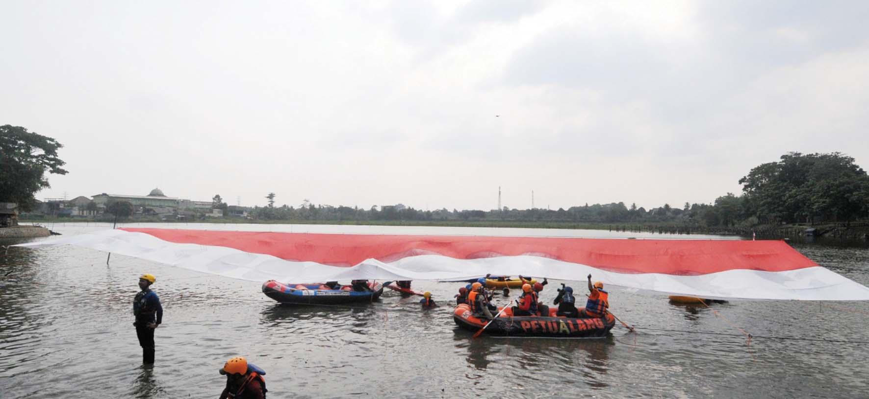 FOTO: SALMAN TOYIBI/JAWA POS SEMARAK KEMERDEKAAN: Relawan mengibarkan bendera merah putih berukuran besar di Situ Gunung Putri, Kabupaten Bogor, kemarin. (foto atas) bendera berukuran 20x30 meter dengan bobot 1,3 ton diterbangkan oleh tim Nusantara Flight dari Lanud ATS Bogor hingga ke Istana Merdeka.