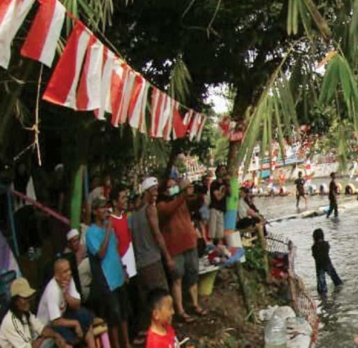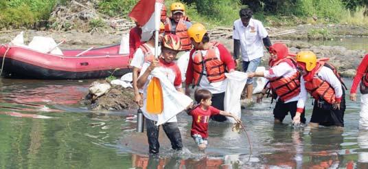 Sebagian warga dibantu anaknya membersihkan Sungai Ciliwung setelah upacara bendera.