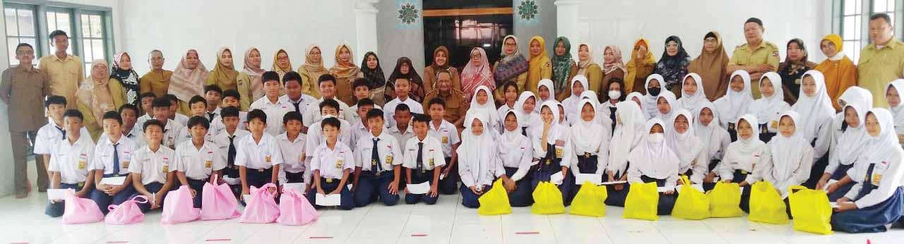 DEWAN Kemakmuran Masjid (DKM) Al-Ihsan bersama siswasiswi SMPN 16 Kota Bogor berbagi kebahagiaan bersama anak yatim dengan memberikan santunan di Mesjid Al-Ihsan SMP Negeri 16