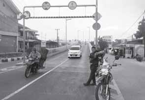 TENJO – Petugas Dishub Kabupaten Bogor melakukan pembatasan kendaraan bagi yang akan melintas di Flyover Soebianto Tenjo. Pembatasan diterapkan terhadap kendaraan bertonase besar yang dilarang melintas di jalan tersebut.